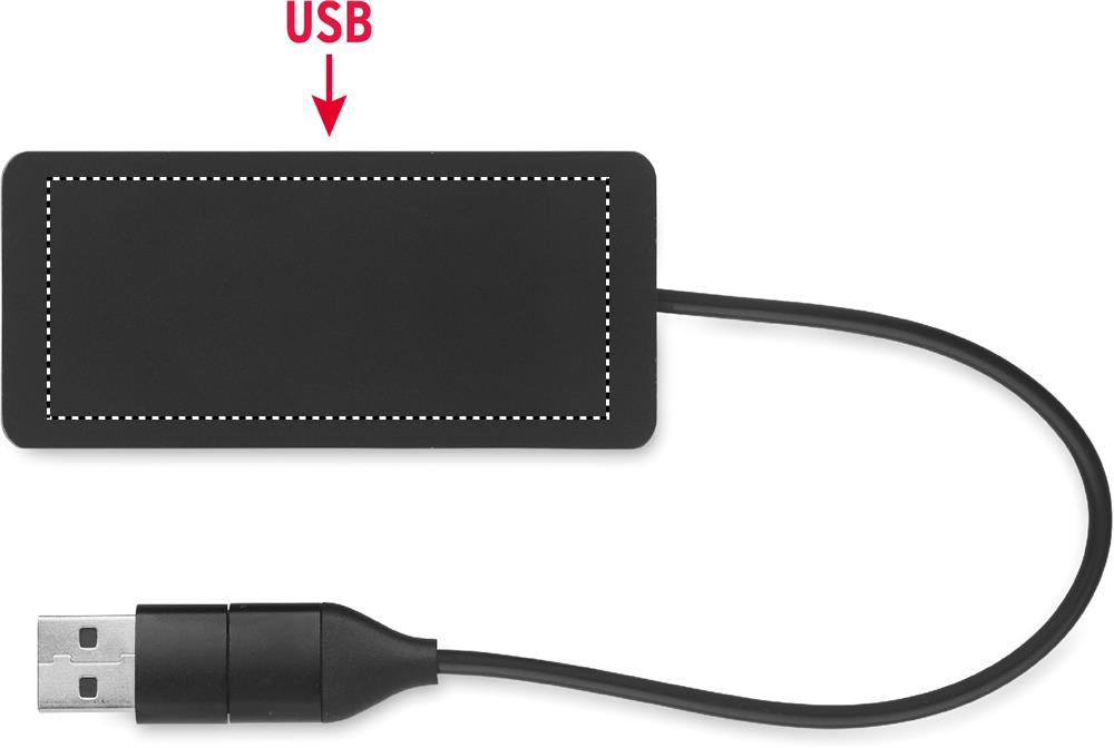 USB Hub aus recyceltem Aluminium mit Ladekabel. Ausgang: 2 x Typ-A und 1 x Typ-C. Eingang: 2-in-1 Typ-C und Typ-A. Kabellänge: 20 cm.