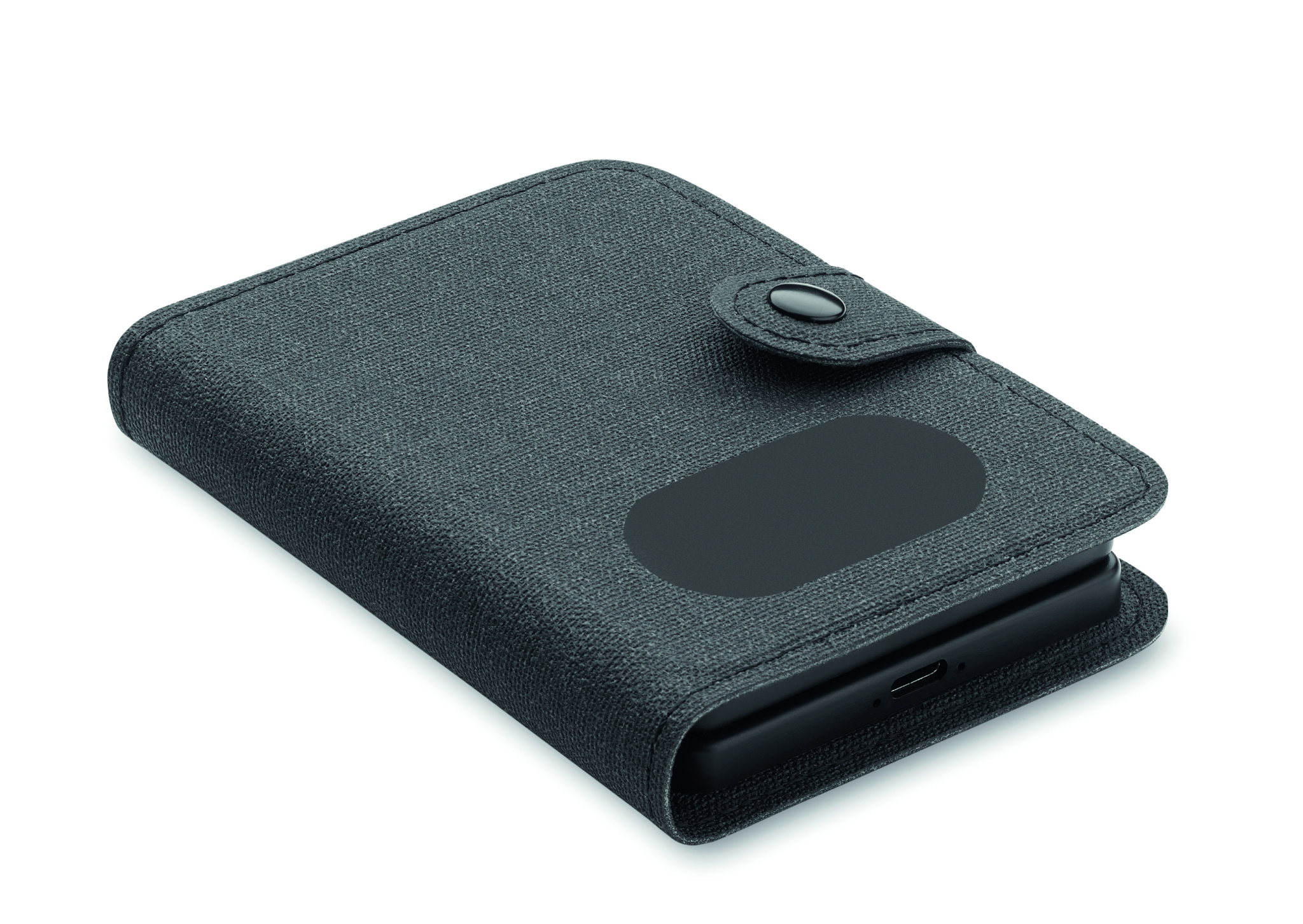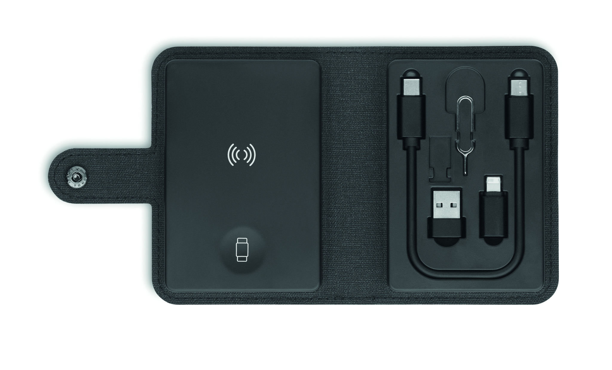Kabel-Set mit kabelloser Ladestation 15W und Smartwatch-Ladegerät (nur Apple®). 4in1 Ladekabel und Auswurftool. Cover aus recyceltem PU, recyceltes ABS und Platte aus recyceltem Aluminium.