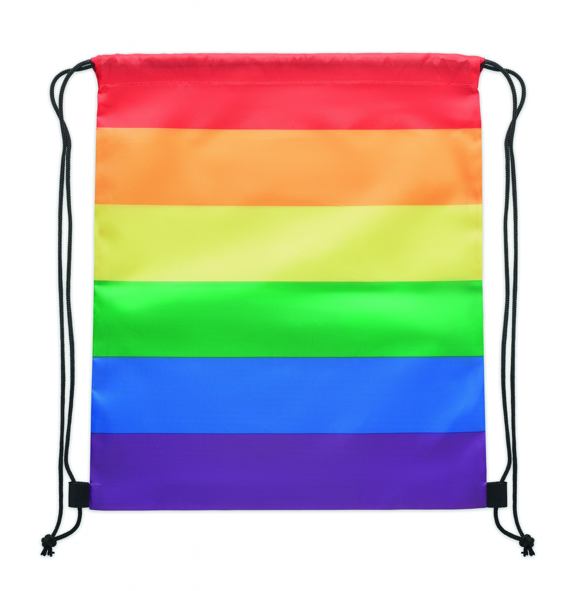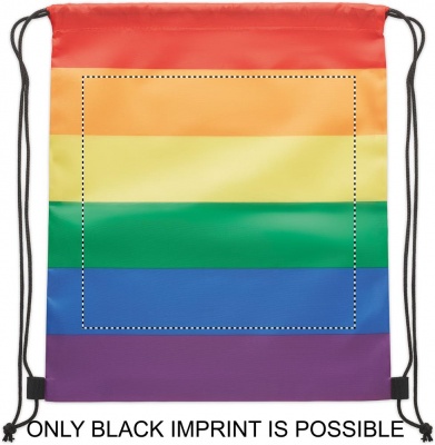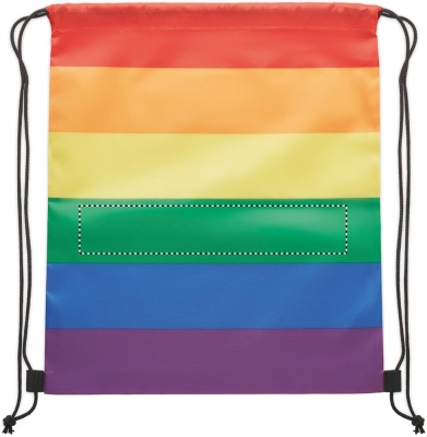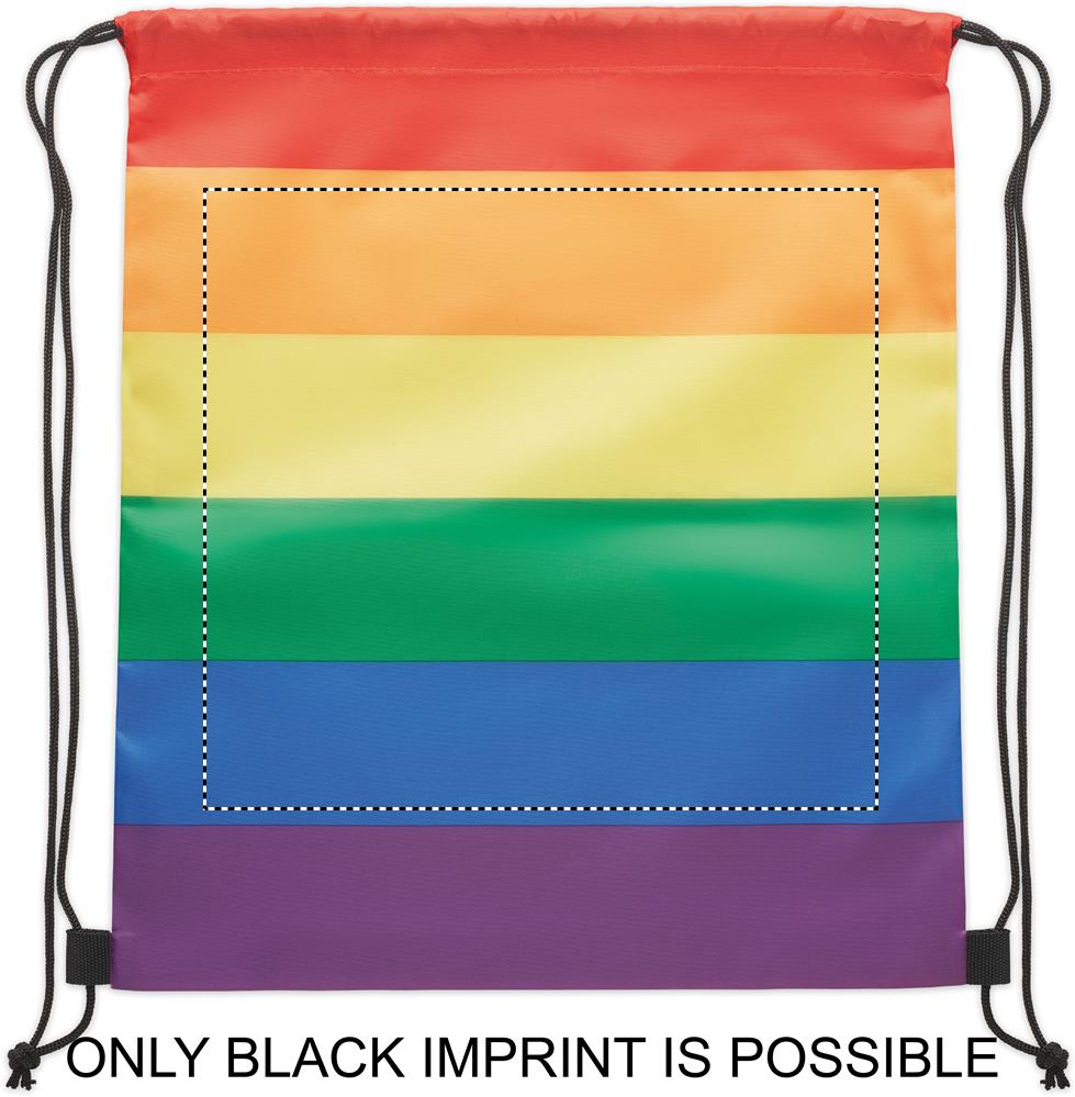 Beutel mit Kordelzug aus 210D RPET-Polyester mit Kordeln aus PP. In Regenbogenfarben.