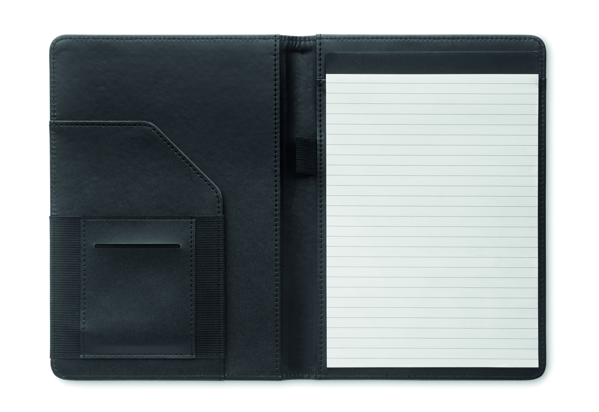 DIN A5 Mappe aus 2tone 300D RPET. Auswechselbarer DIN A5 Notizblock. 20 Blatt (40 Seiten) liniertes weißes Bambuspapier Stiftschlaufe. Kartenfächer und großes Fach in der Innenseite.