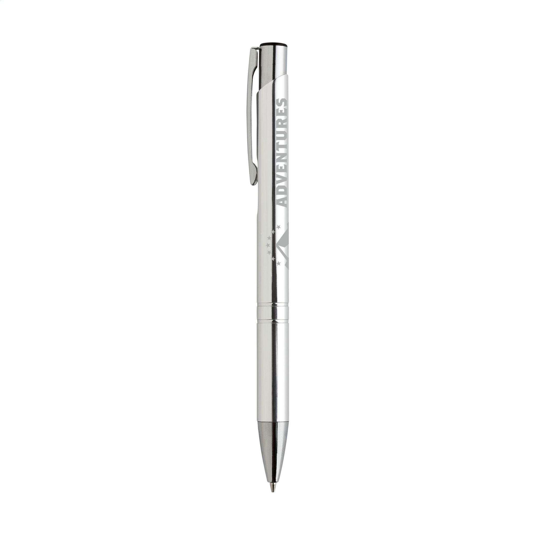 Blauschreibender Aluminium-Kugelschreiber mit glänzendem Schaft in Metallic-Optik und Metallclip.