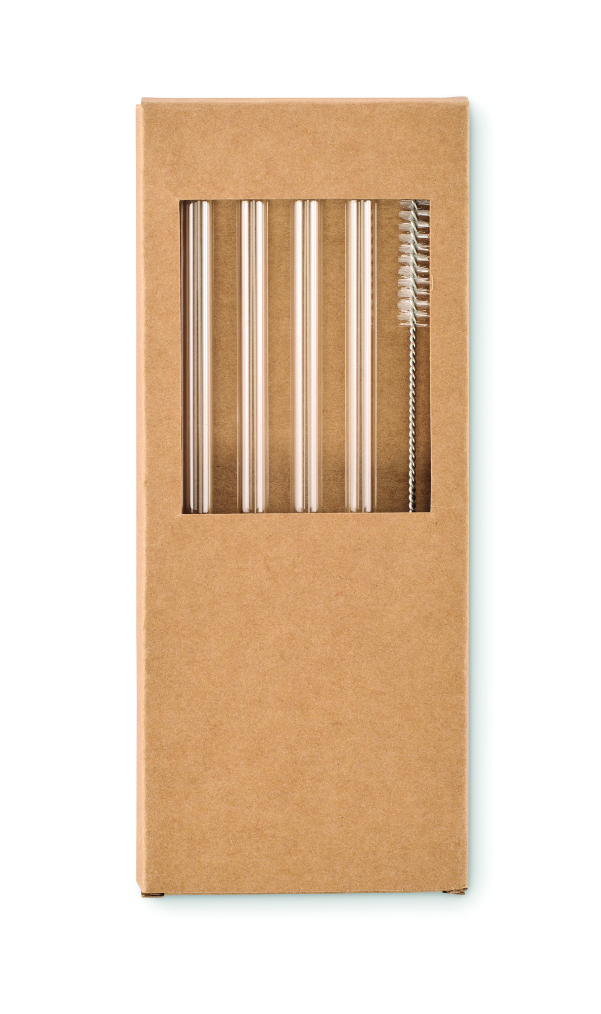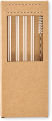 Set mit 2 wiederverwendbaren Trinkhalmen aus Borosilikatglas und Reinigungsbürste. Lieferung in Pappschachtel.