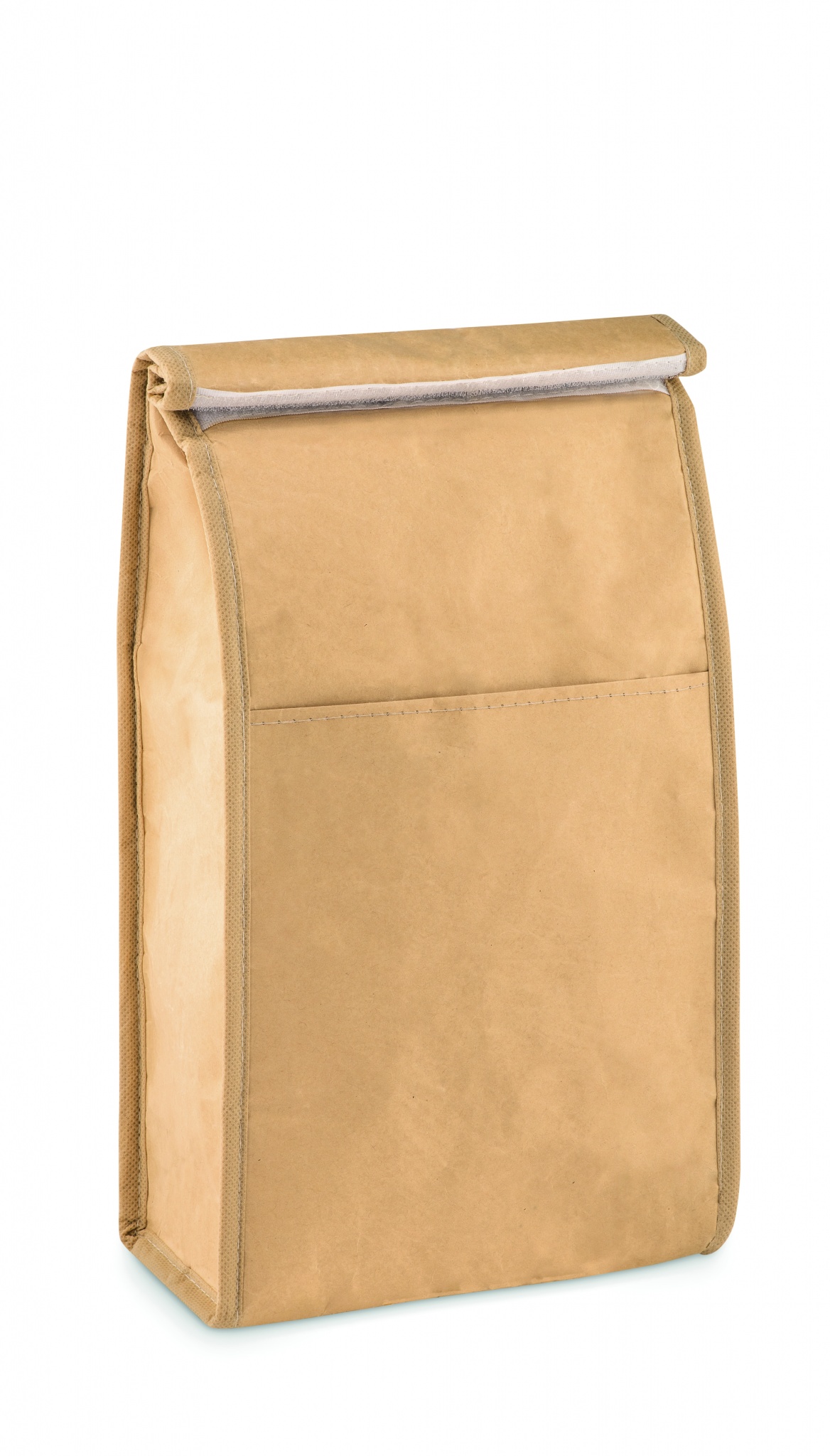 Lunchbag aus Kraftpapier mit Fronttasche. Füllmenge: 3l. Klettverschluss. Isoliermaterial: PE-Schaumstoffschicht.