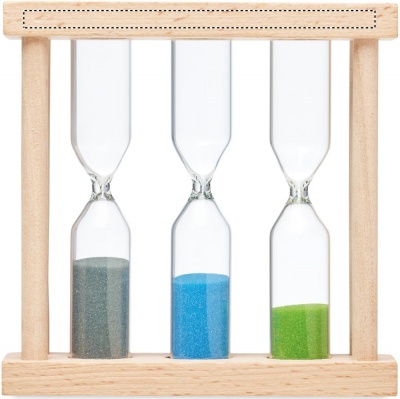 Sanduhr mit 3 unterschiedlichen Zeitanzeigen (ca. 1, 3 und 5 Minuten). Halterung aus Holz.