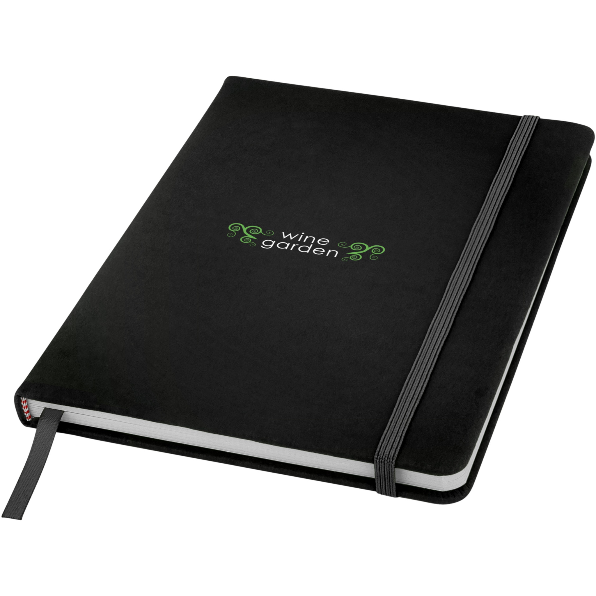 A5 Notizbuch mit farblich passendem elastischen Verschluss und Leseband. Inkl. 96 Blatt (60 g/m²), blanko.