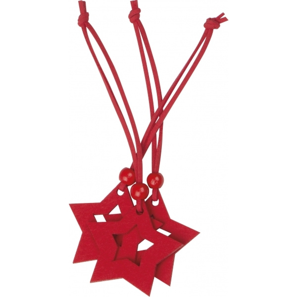 Set aus drei roten Filzsternen mit Kordel und Holzperle, dekorativ nicht nur zur Weihnachtszeit. Ihr Logo wird per Etikett auf die Einzelverpackung aufgebracht.