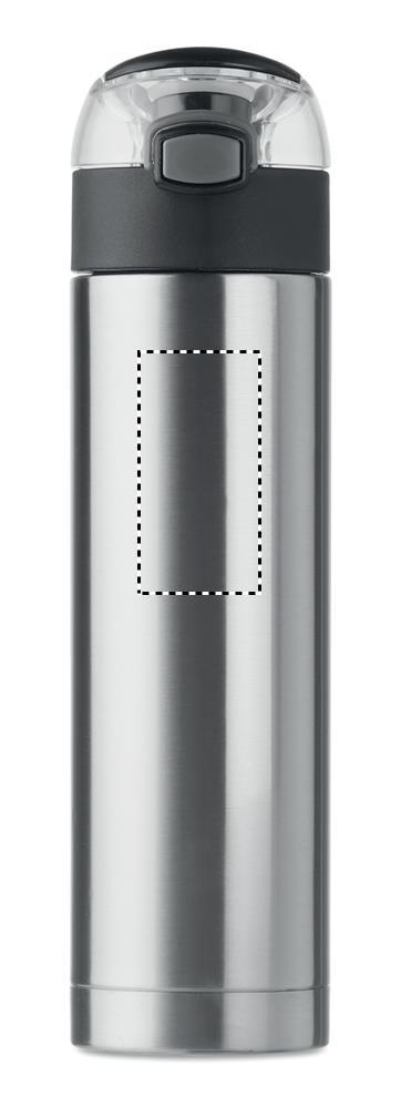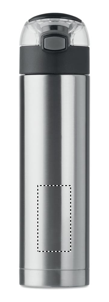 Doppelwandige Trinkflasche aus Edelstahl mit Sicherheitsverschluss im Deckel und Öffnen-durch-Drücken Funktion. Mit faltbarem Griff. Füllmenge: 400 ml. Auslaufsicher.