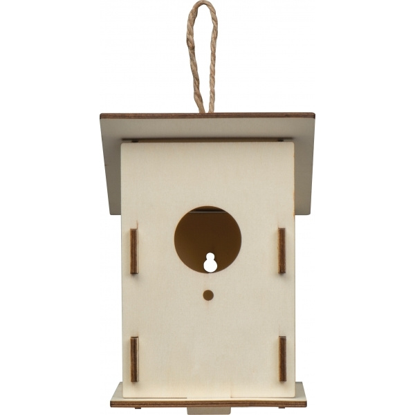 Vogelhäuschen aus Holz zum Zusammenbauen. Ihre Werbung wird auf der Vorderseite per Laser eingraviert.