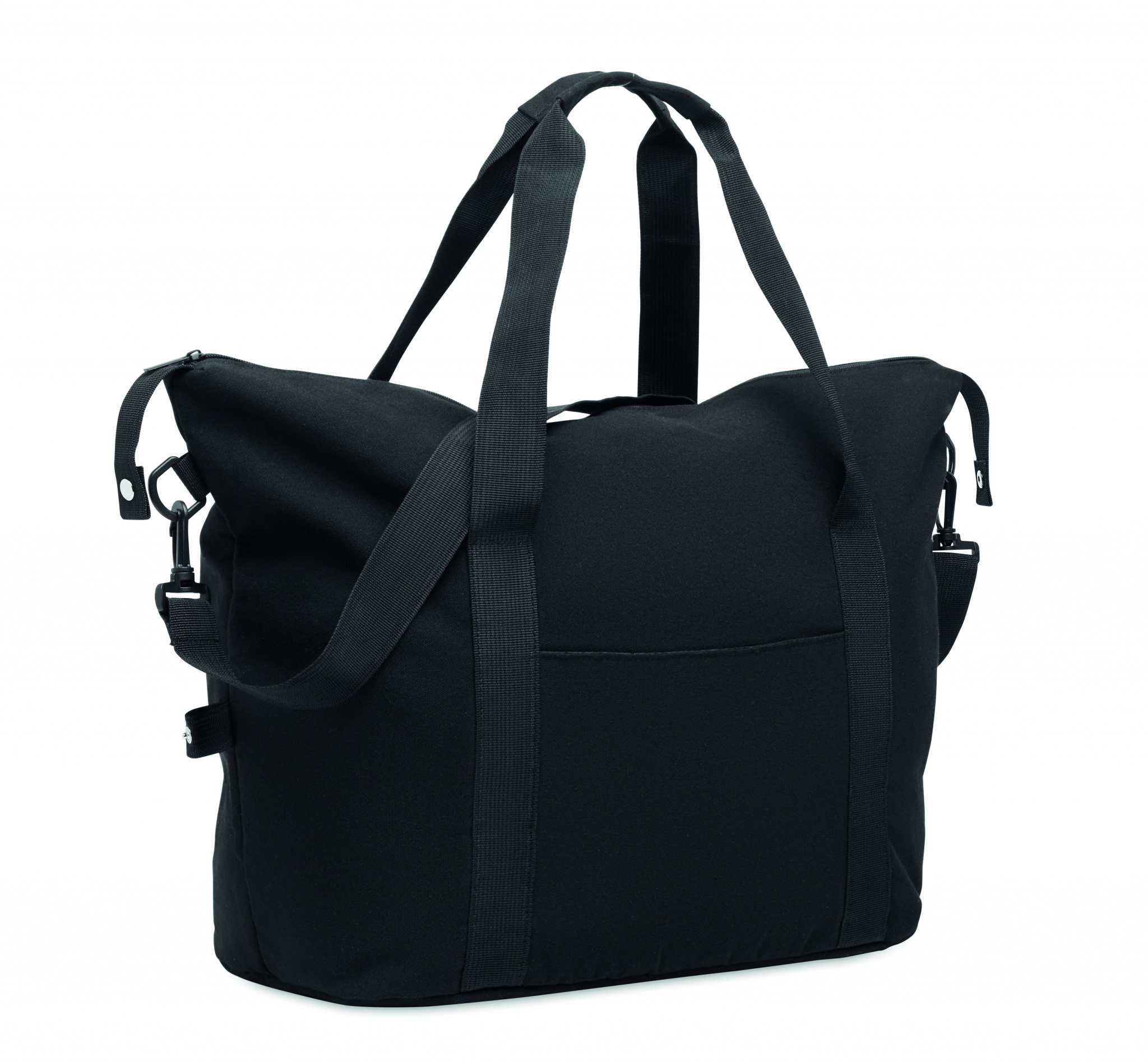 Weekender aus recycelter Pre-Consumer-Baumwolle (70%) und recyceltem Polyester (30%) mit Futter aus 210D RPET-Polyester. Fronttasche, Tasche mit Reißverschluss, abnehmbarer und verstellbarer Schultergurt und gepolsterter Boden. Trolley-Halterung.