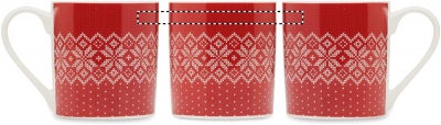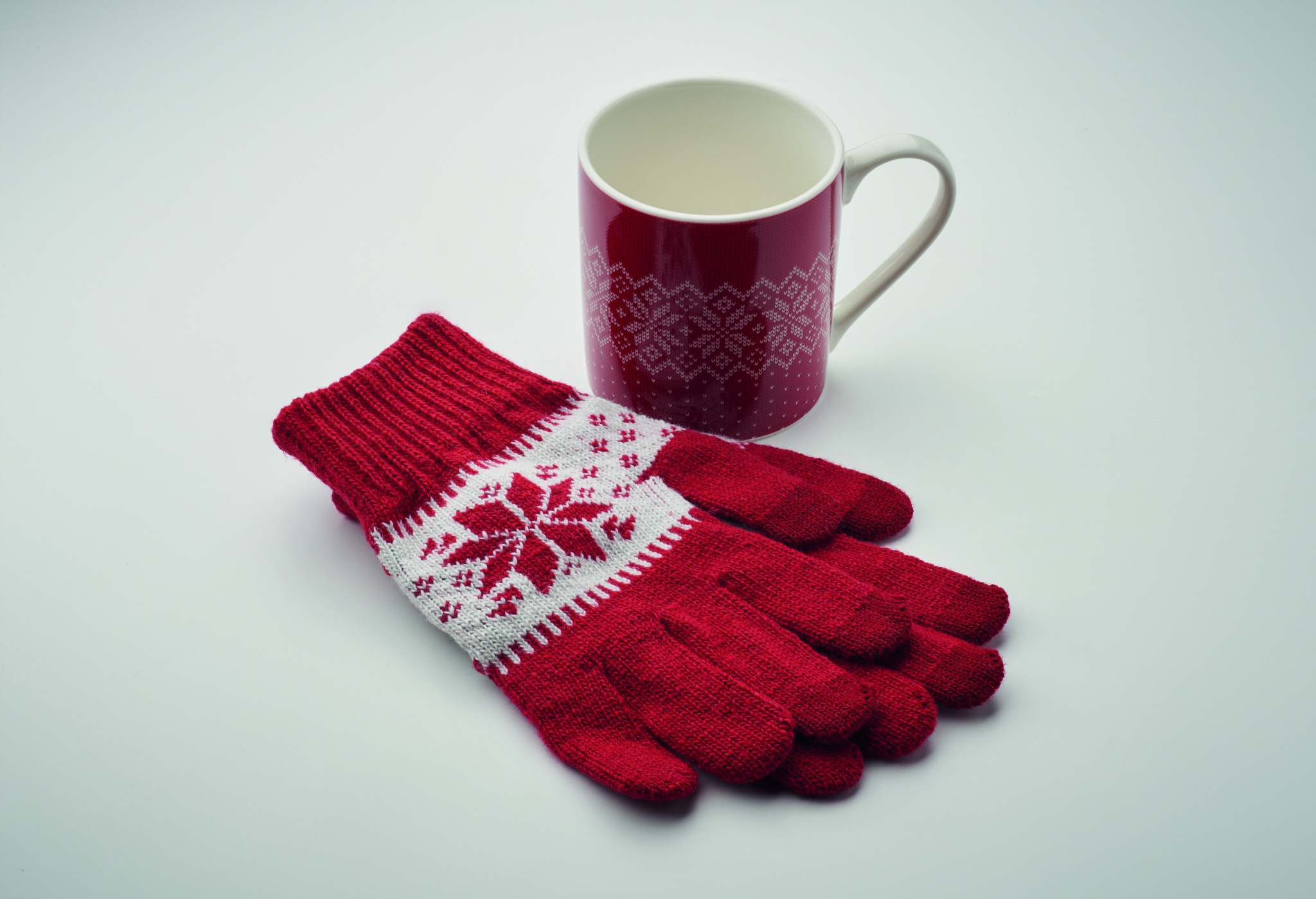 Winterliches Geschenkset, bestehend aus einem Paar gestrickter, taktiler Handschuhe und Keramikbecher. Schneeflockenmuster. Füllmenge: 300 ml. Lieferung in passender Schachtel.