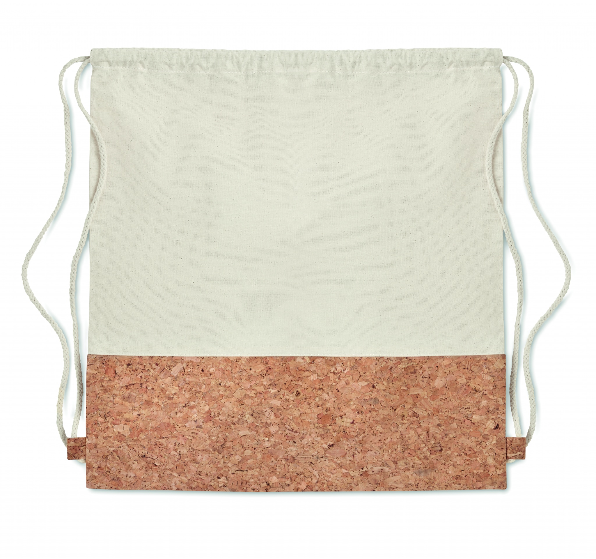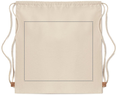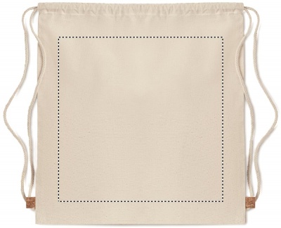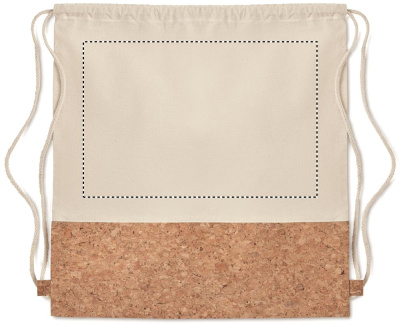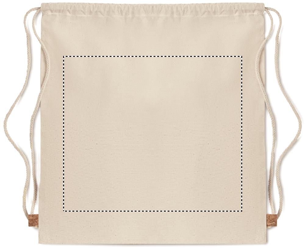 Twill cotton drawstring bag with a cork detail. 160 gr/m². Cork is a natural material, due to its structural nature and surface porosity the final print result per item may have deviations.