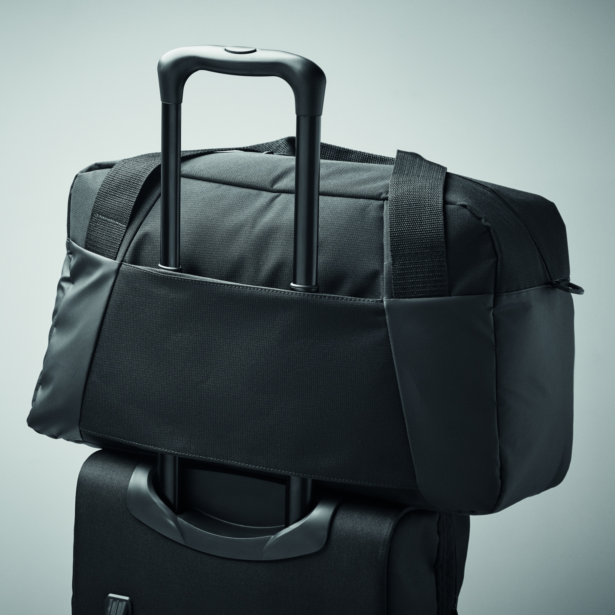 Travel or sports bag in 300D ripstop with PU details with front zippered pocket. It has an inside pocket and 2 small padded compartments. Trolley holder on back side.