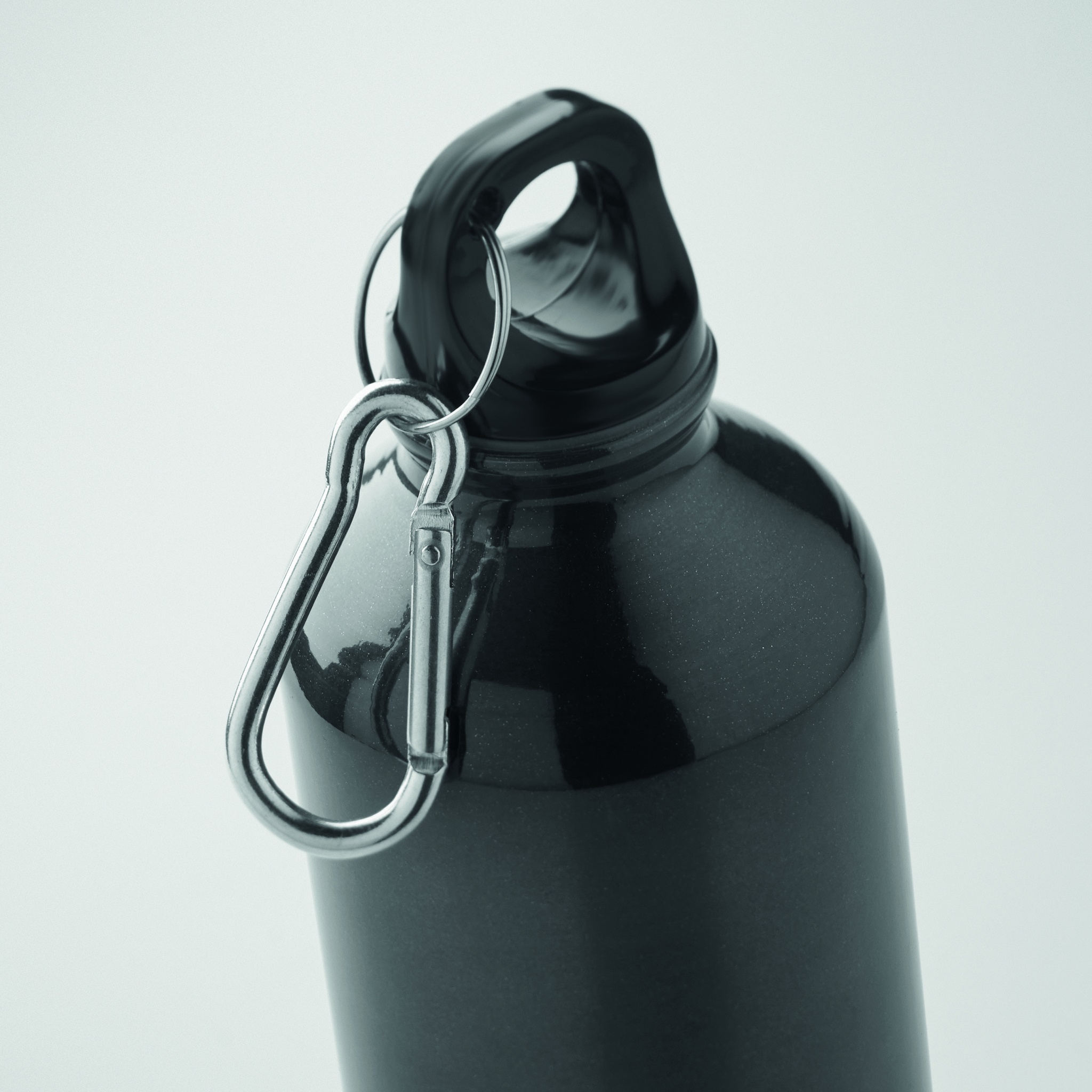 Single wall recycled aluminium bottle with carabiner. Capacity: 500 ml. Leak free. The carabiner is not for climbing (non professional use). Sublimation print available on white item only.