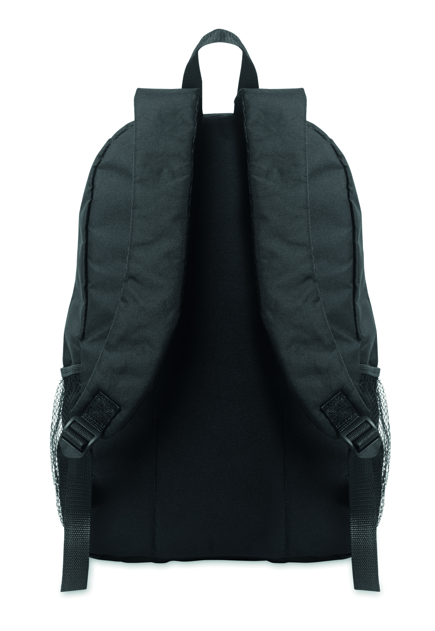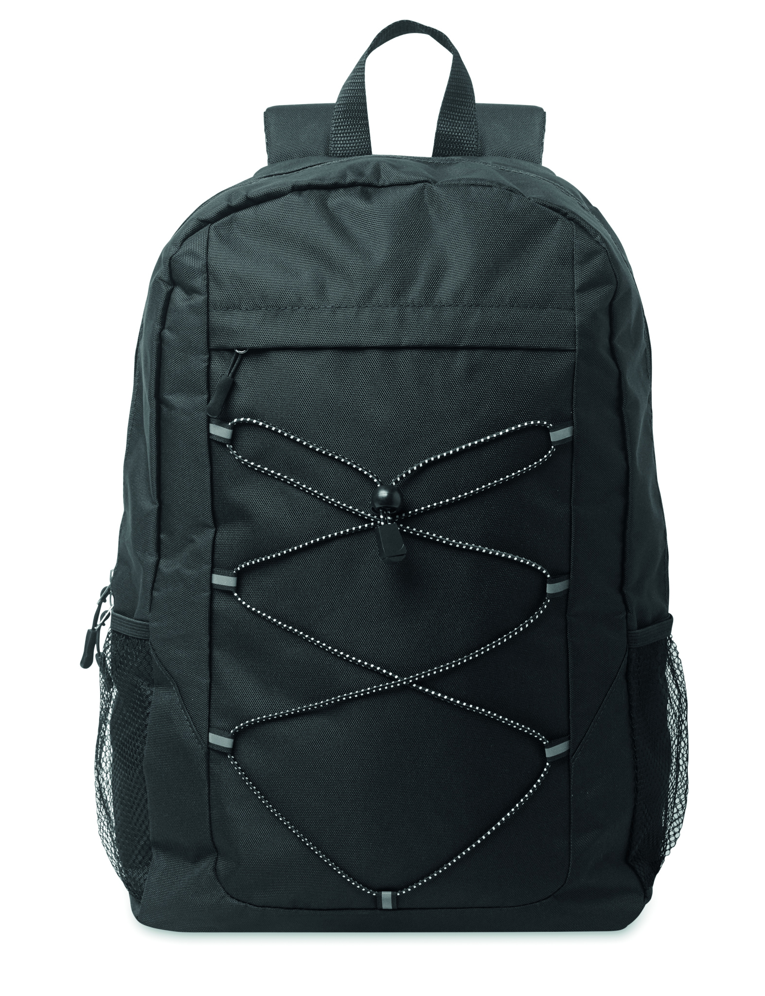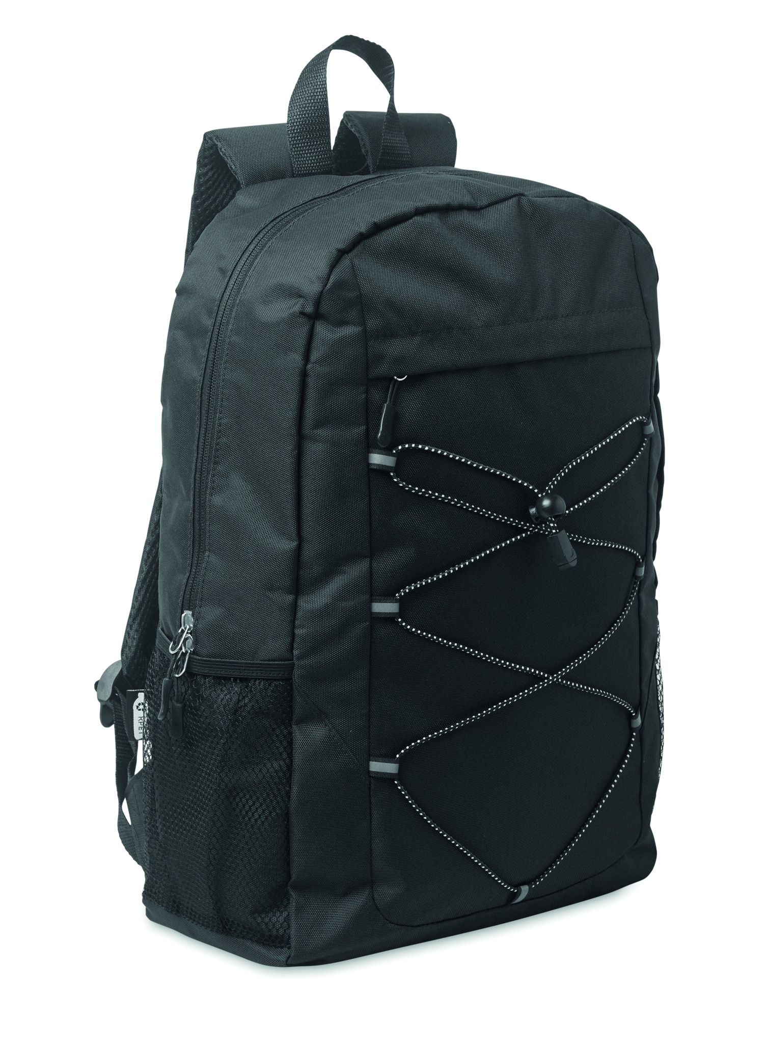Backpack in 600D RPET polyester with decorating cord and front zippered pocket panel. Mesh pockets on both sides.