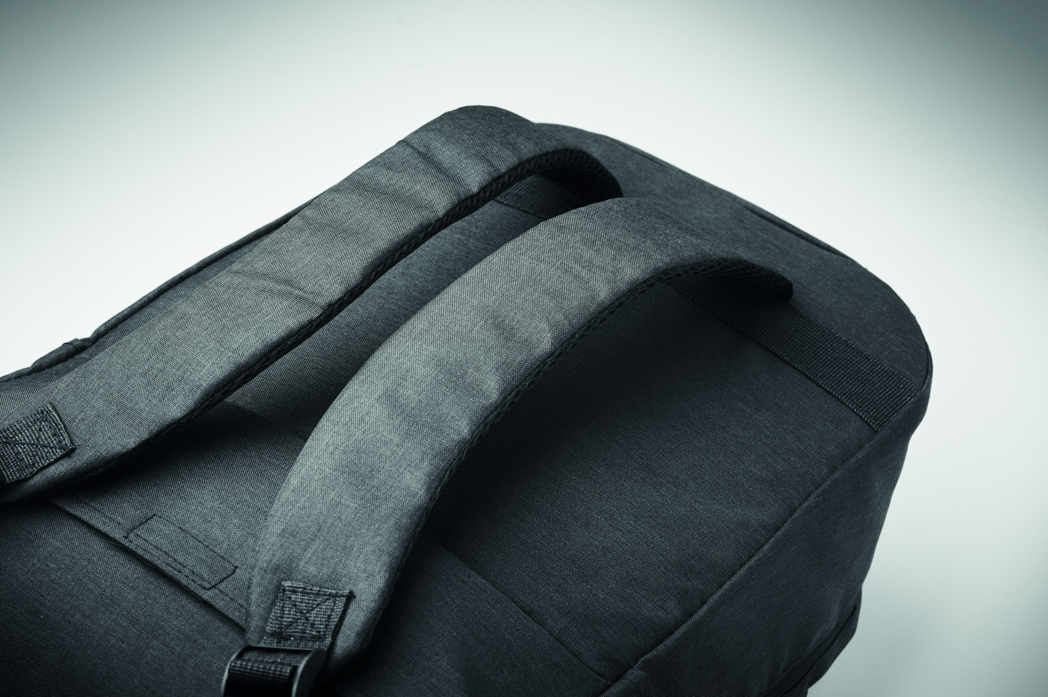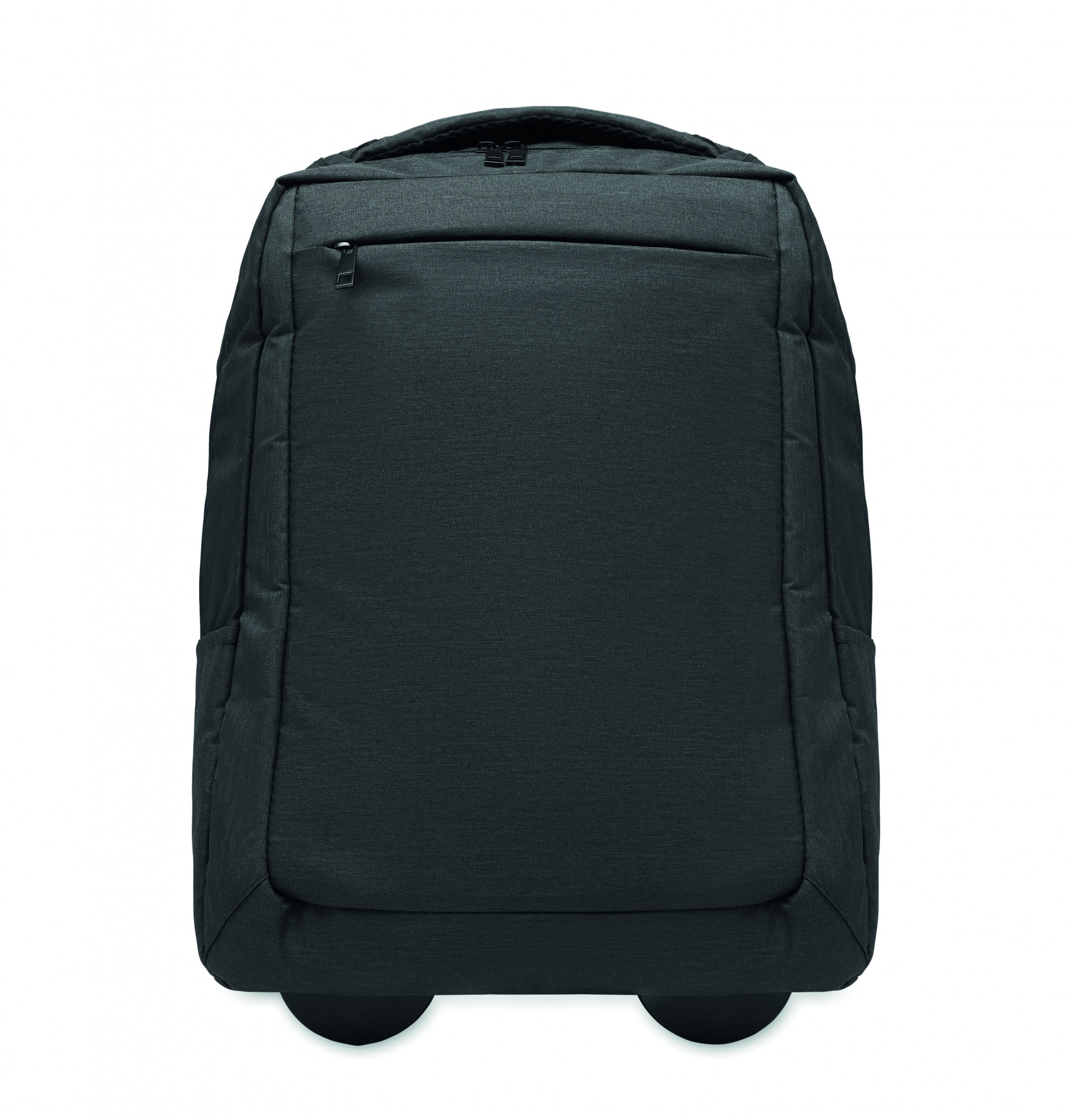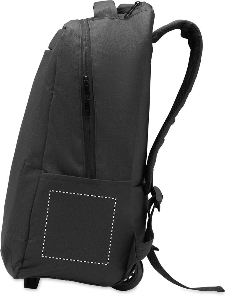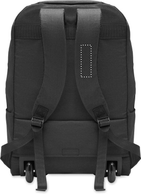 Laptop backpack trolley with wheels in 600D RPET polyester. Includes one internal 15 inch laptop compartment. Zippered front pocket. Two side slip pockets. Three inner slip pockets. Padded back and shoulder straps. 2 wheels and double tube frame.