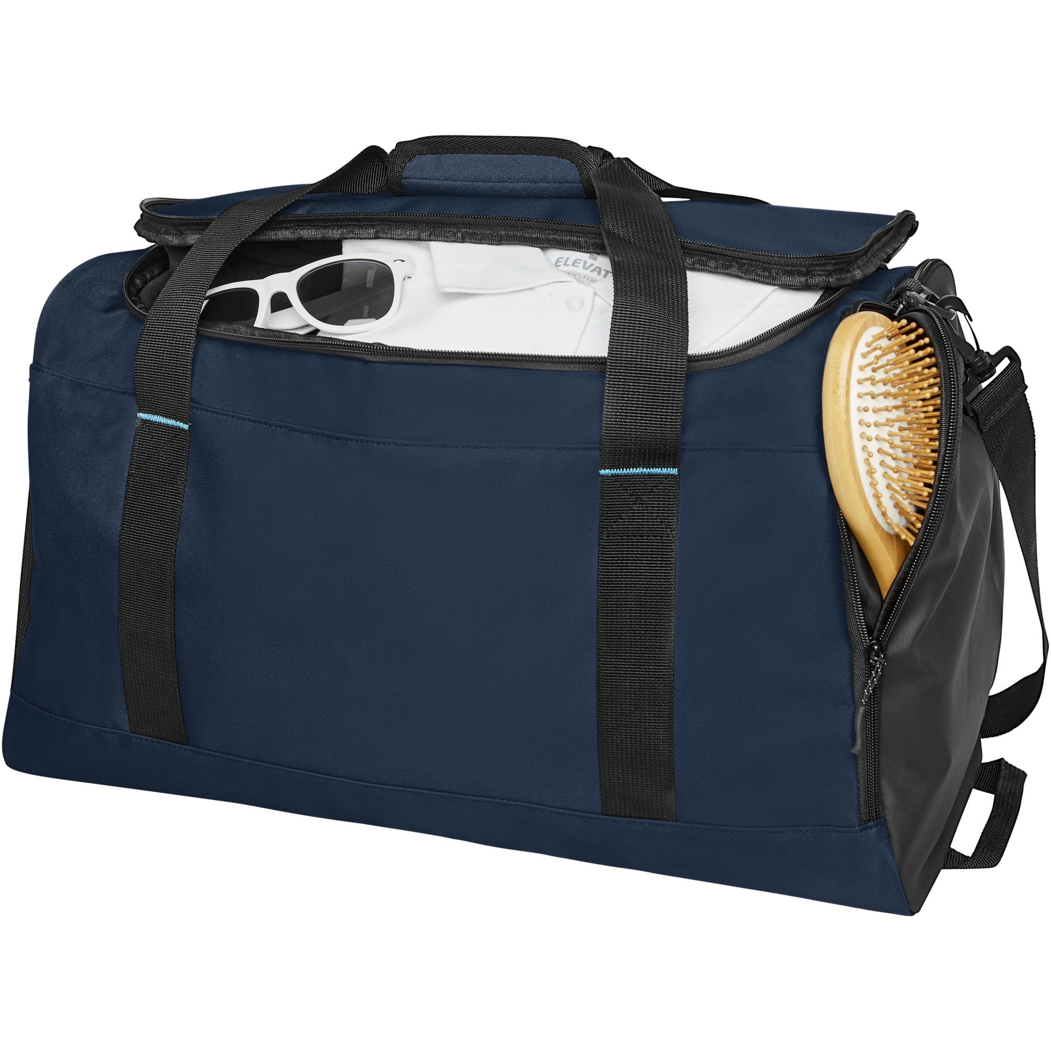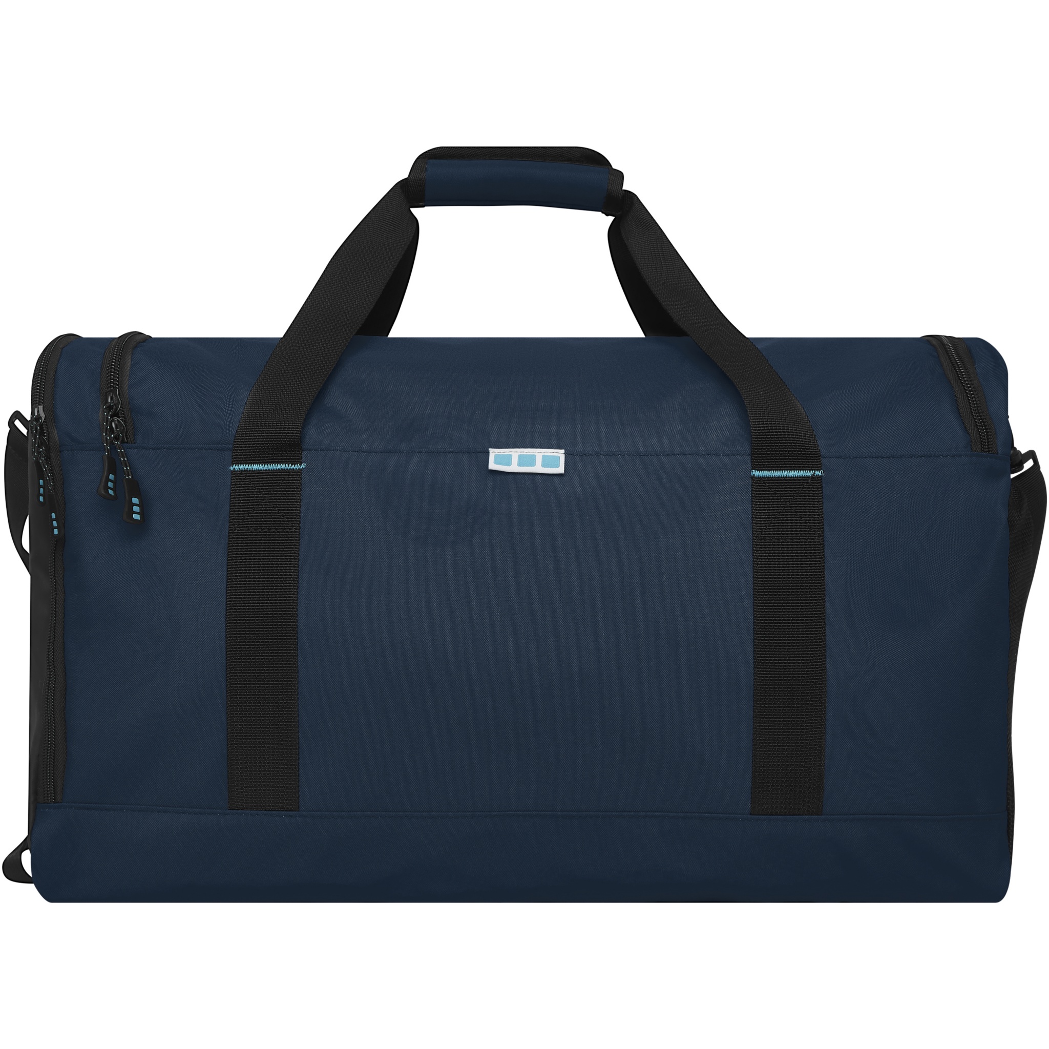 Sustainable GRS certified RPET duffel bag made with 55% recycled materials. Features a large zippered main compartment, a reinforced base panel, a side mesh pocket, and an expandable wet/dry zippered pocket. Comes with a small zippered internal pocket for organization, removable and padded shoulder strap, grab handles with padded velcro closure, and an extra grab handle on the bottom right side.
