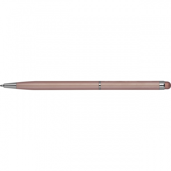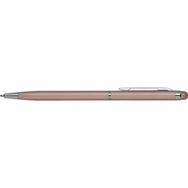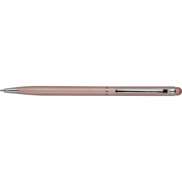 Metal ballpen with blue-writing plastic refill and color-matched touch function above the clip. We will engrave your logo below the clip.