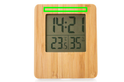 Bamboo weather station with 3 functions: time/date, indoor humidity and temperature. Including 2 AAA batteries for direct use. Bamboo and ABS material. Humidty tolerance max 5%.