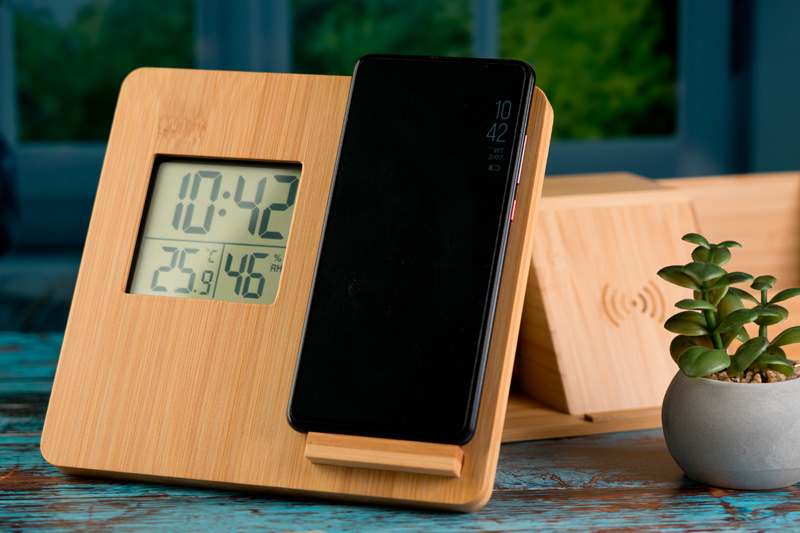Bamboo weather station / wireless charger with digital display showing temperature, humidity and time. Provides a stable stand. Your logo will be engraved on the front.