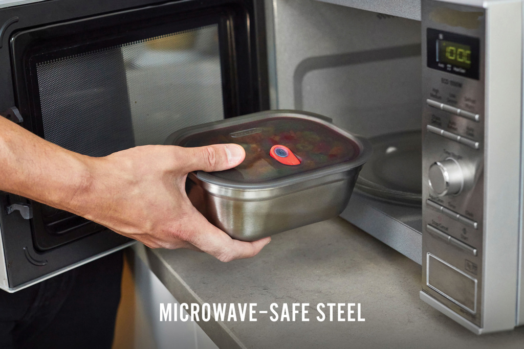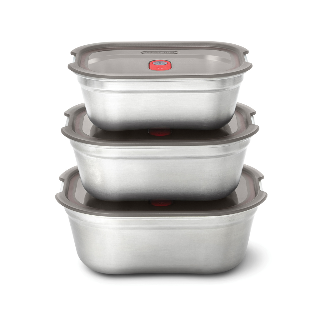 This set of three microwavable stainless steel meal prep boxes is designed for everyday use—lightweight, durable, and airtight. Whether for breakfast, lunch, or snacks, they’re ideal for food storage, on-the-go lunches, or oven-to-table meals. Each container features an innovative microwave-safe steel construction, with a vacuum-sealed, leak-proof lid that keeps food fresher for longer. The semi-transparent lid lets you see what’s inside at a glance, while the high-quality stainless steel base is dishwasher-, freezer-, and oven-safe (lid not oven-safe). The removable seals make cleaning effortless. The unique lid-lock vent allows you to microwave your food without removing the lid, reducing heat-up time and preventing splatter. Designed to nest for compact storage or stack when using the same size, these BPA-free containers offer smart functionality for every meal.