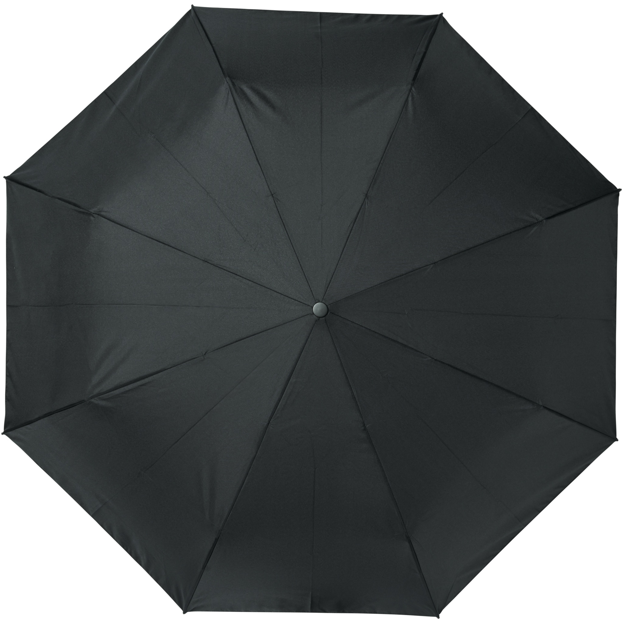 Automatic open and close folding umbrella with a recycled PET pongee polyester canopy. Sturdy metal shaft, a high quality frame with fibreglass ribs offering maximum flexibility in windy conditions. Supplied with a pouch and can easily fit a handbag or backpack for convenient carrying. Together with the wooden handle and the recycled PET pongee polyester canopy it offers a sustainable choice. Available in an wide variety of contemporary colours with a large decoration area on each of the panels.
