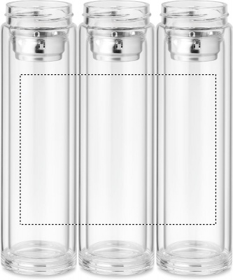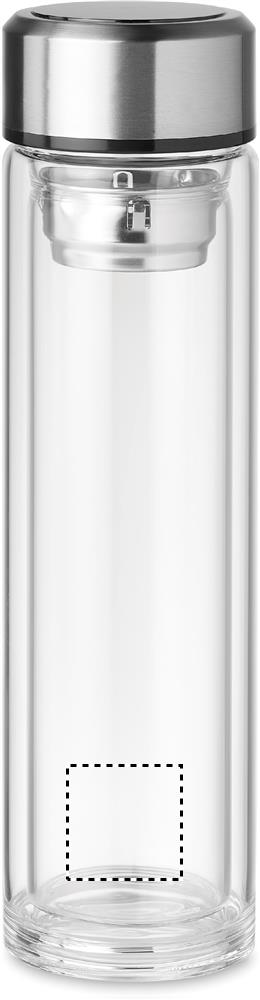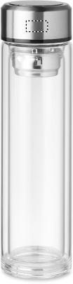 Double wall borosilicate glass bottle. It has an LED touch thermometer incorporated in to the top of the lid and tea infuser inside. 1 replaceable CR2032 battery included. Leakproof. Capacity: 390 ml. Leak free.