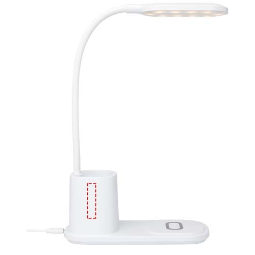 Desk lamp with an integrated wireless charger and pencil holder. The lamp has 3 lightning settings (warm/cold/medium) and can be adjusted in height. The charger has 10W wireless output and is compatible with all Qi devices (iPhone 8 or above and Android devices that supports wireless charging).
