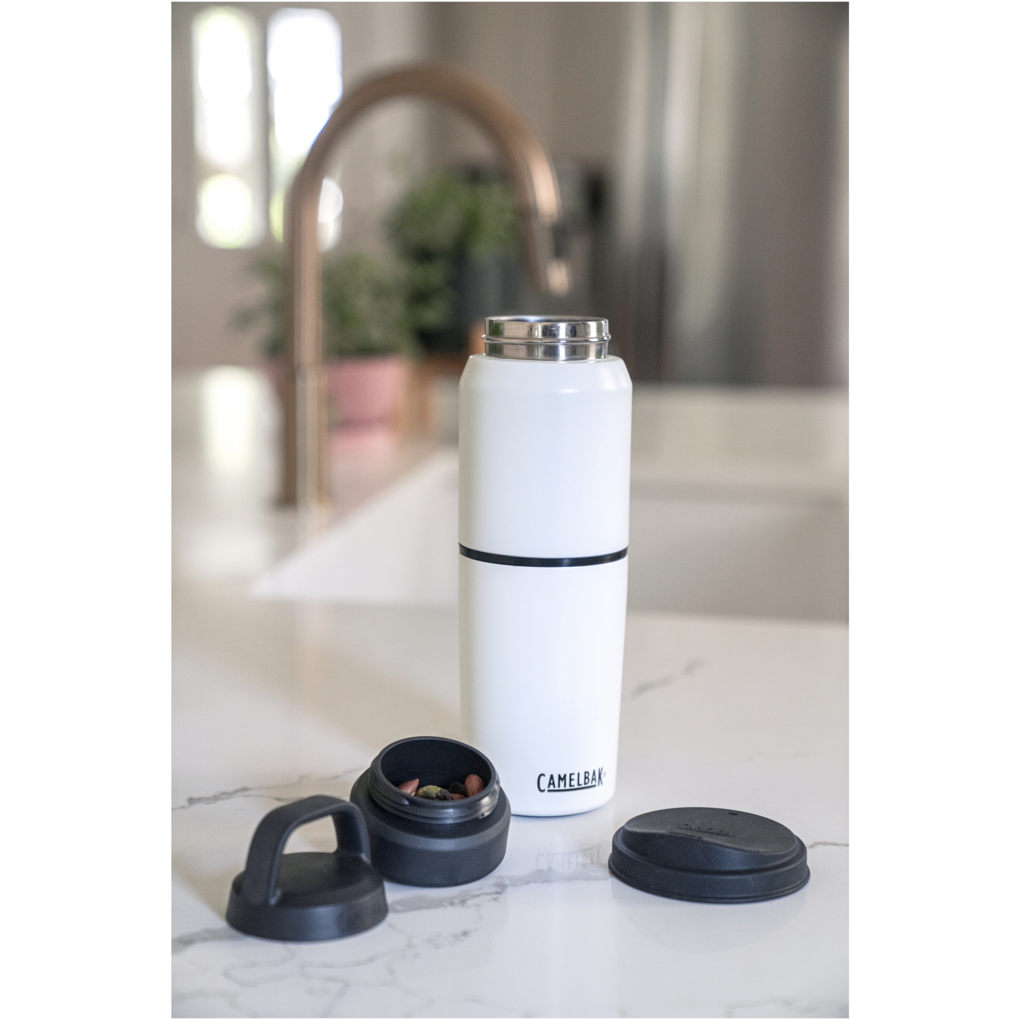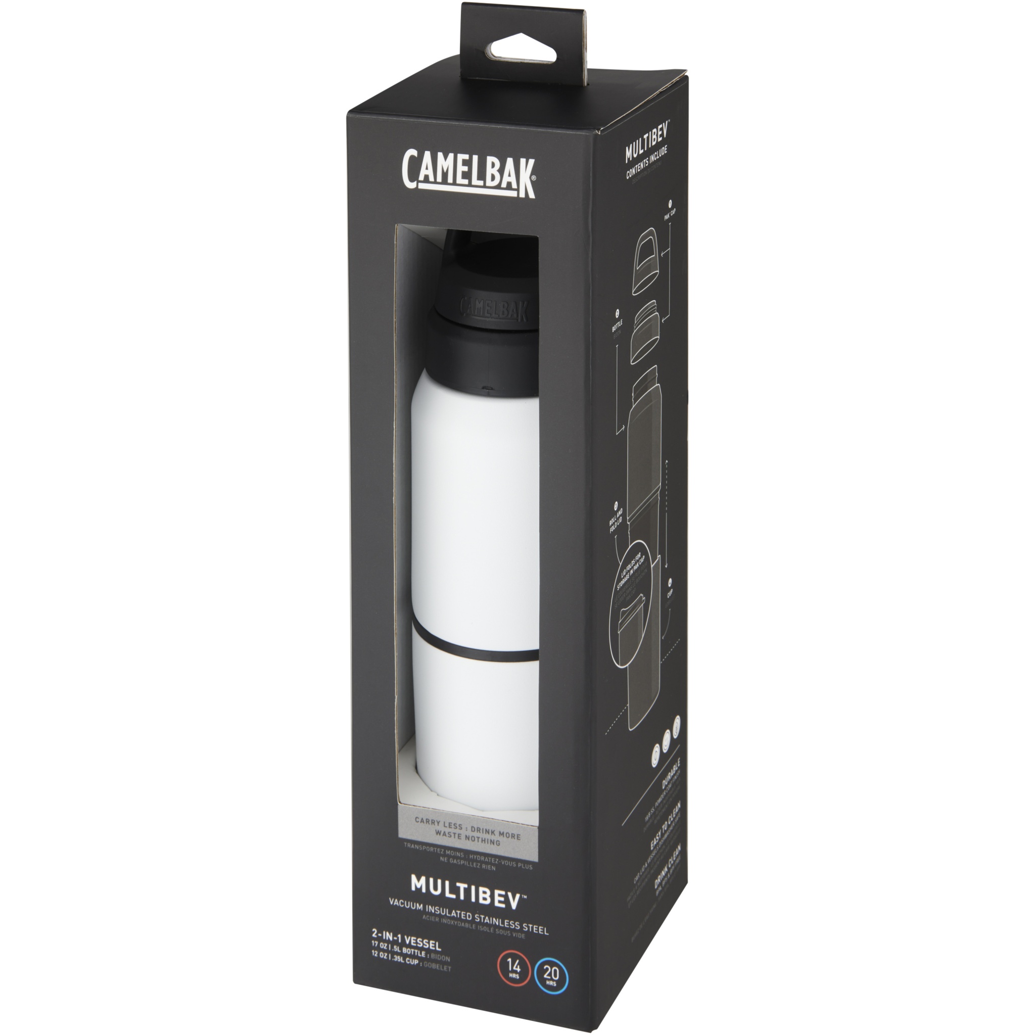The ultimate beverage multi-tasker for on-the-go sustainability and versatility. The MultiBev is a 2-in-1 vessel that serves as both a sports bottle and detachable travel cup. Use for coffee in the morning, water throughout the day, and camp-out beers with friends at night. Drink. Share. Rinse and repeat. The double-walled vacuum insulated stainless steel construction keeps beverages hot or cold for hours. A powder coat finish and non-slip silicone base create a highly durable exterior. The leak-proof Pak™ cap tucks the roll and fold lid neatly out of sight until paired with the removable cup, or stores small essentials like a tea bag or snacks. Easy-to-clean. BPA-, BPS-, and BPF-free.