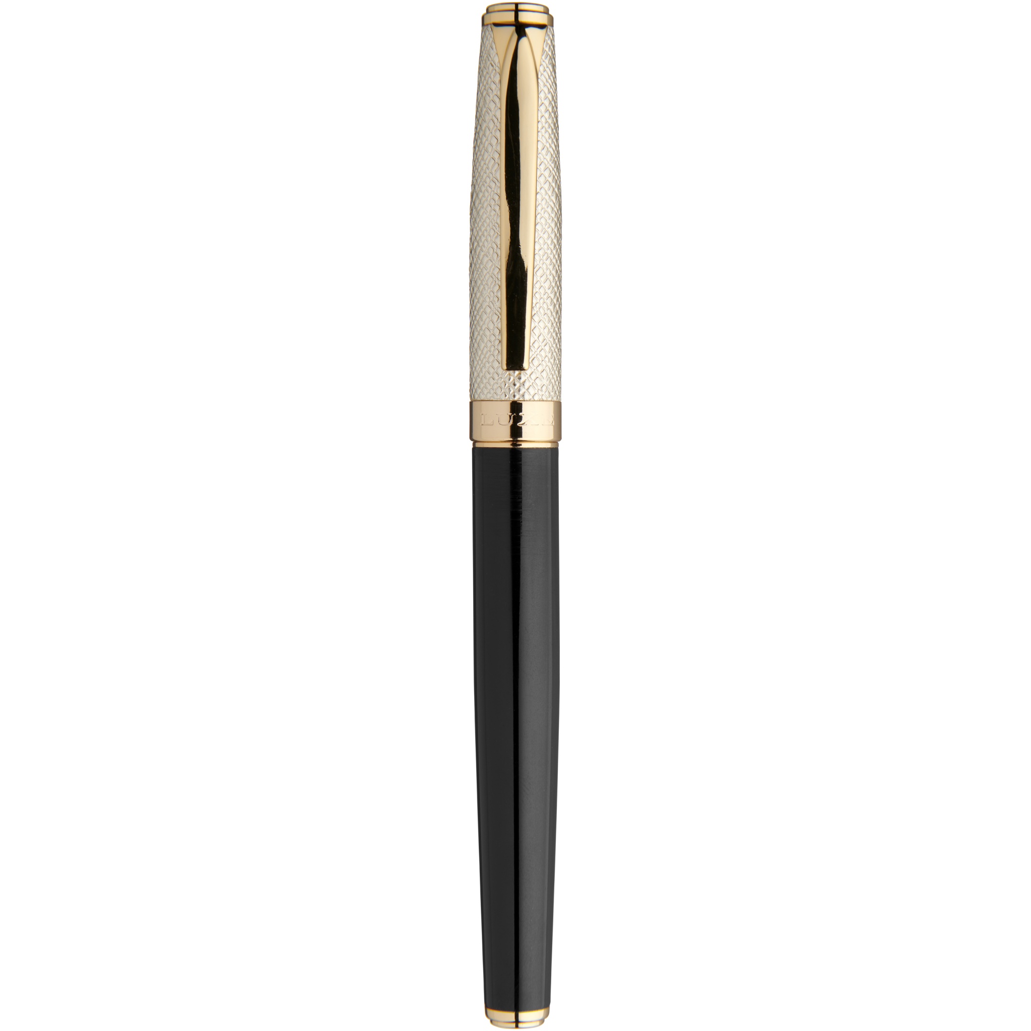 A luxurious rollerball pen, with gold leather cap and lacquered golden parts, delivered in a Luxe gift box. Lower barrel is made out of brass with lacquer and upper barrel out of brass and PU. Rollerbal pen: 14 cm x 1.15 cm, weight: 32 gr, writing length: 500 m.