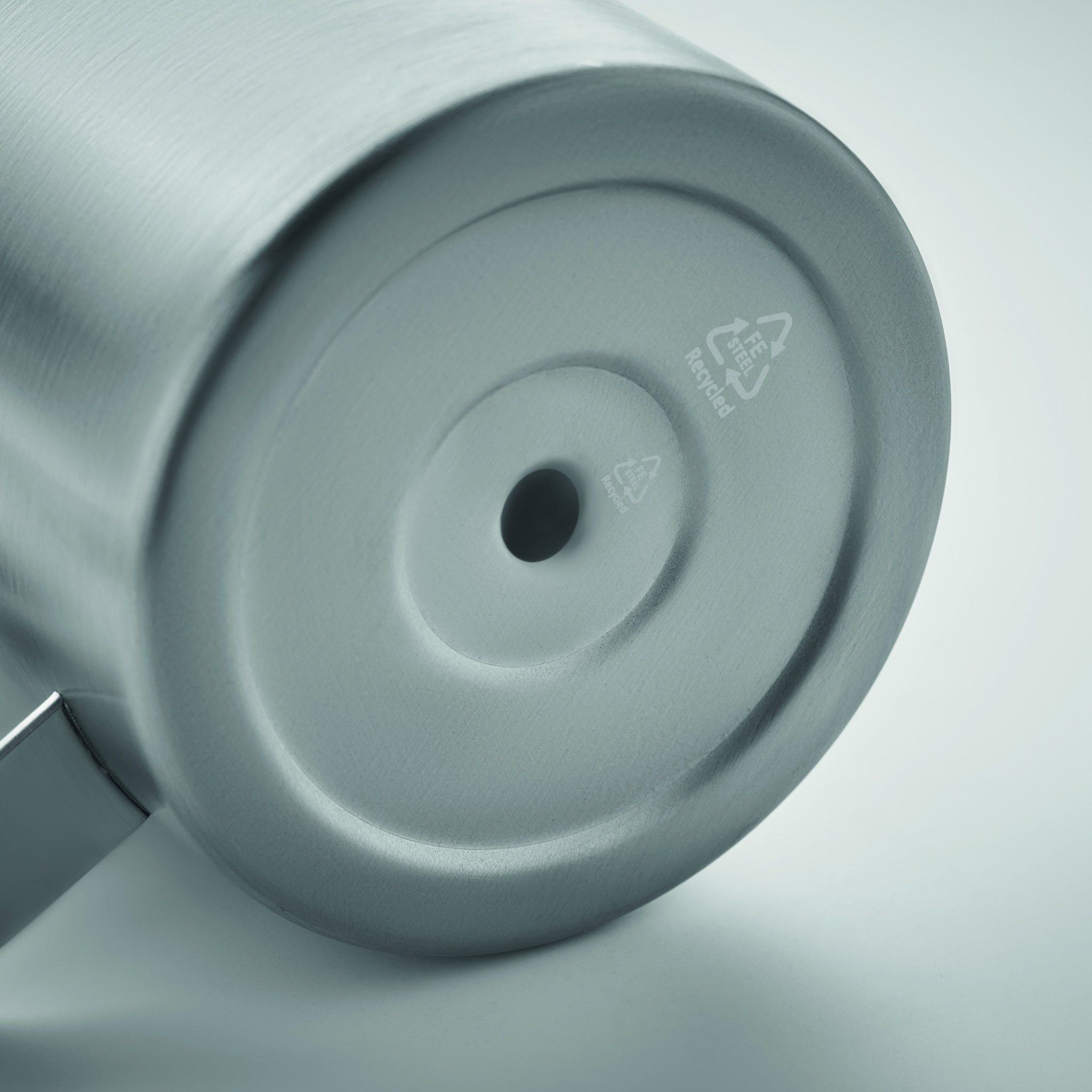 Double wall recycled stainless steel (90% recycled stainless and 10% stainless steel) mug with sliding sip hole cover. Capacity: 300 ml.