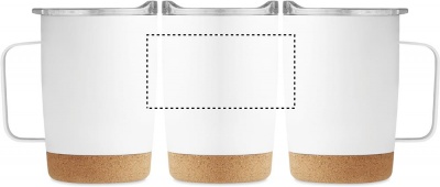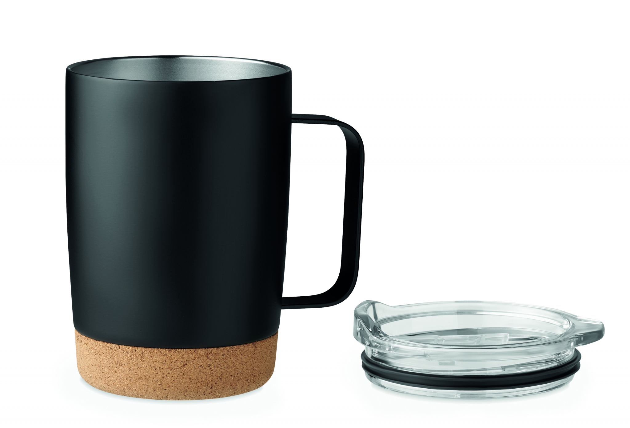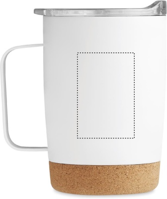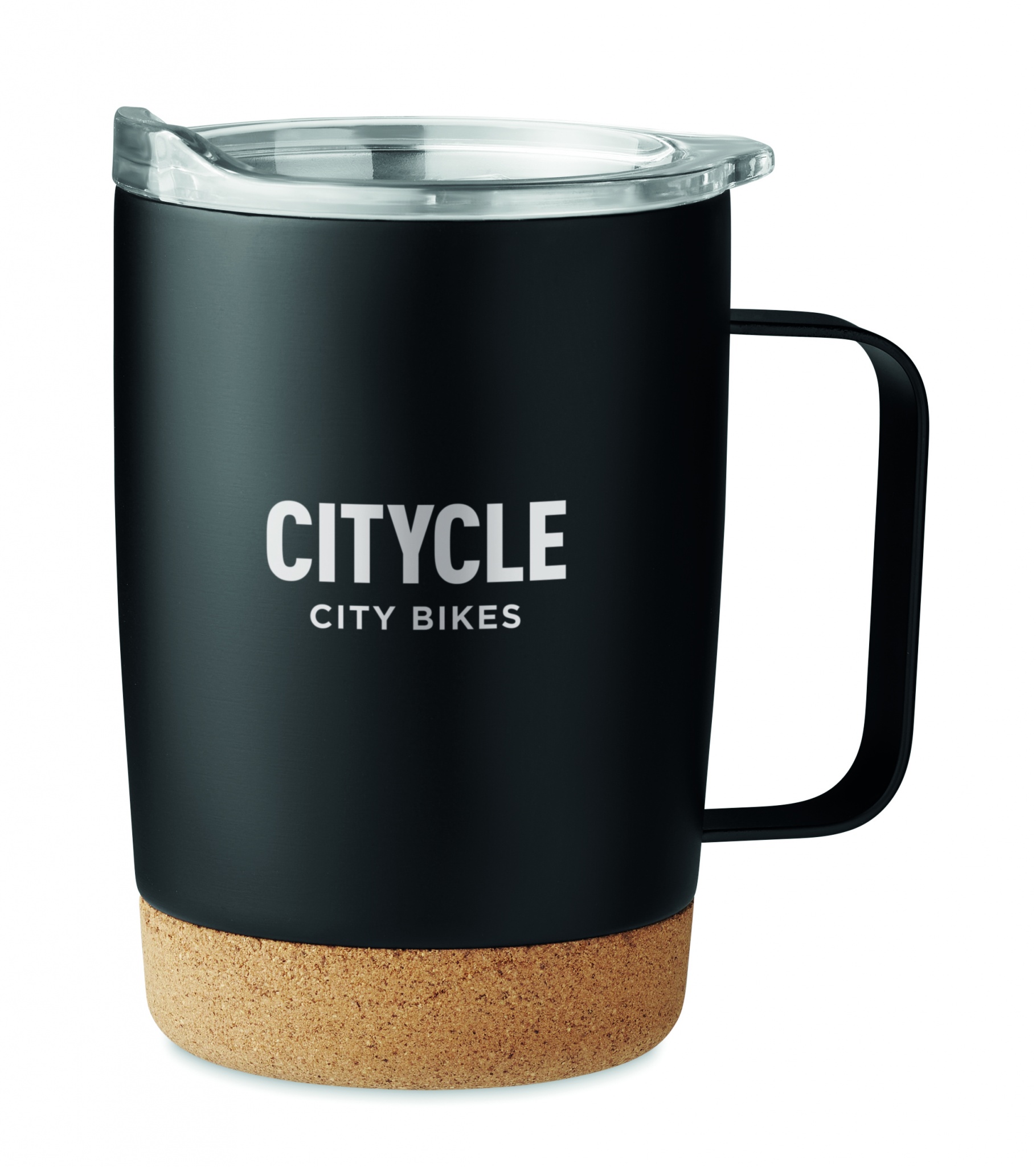 Double wall stainless steel mug with cork base and sliding sip hole cover. Capacity: 300 ml. Cork is 100% natural material. Due to its structural nature and surface porosity the final print result per item may have deviations.