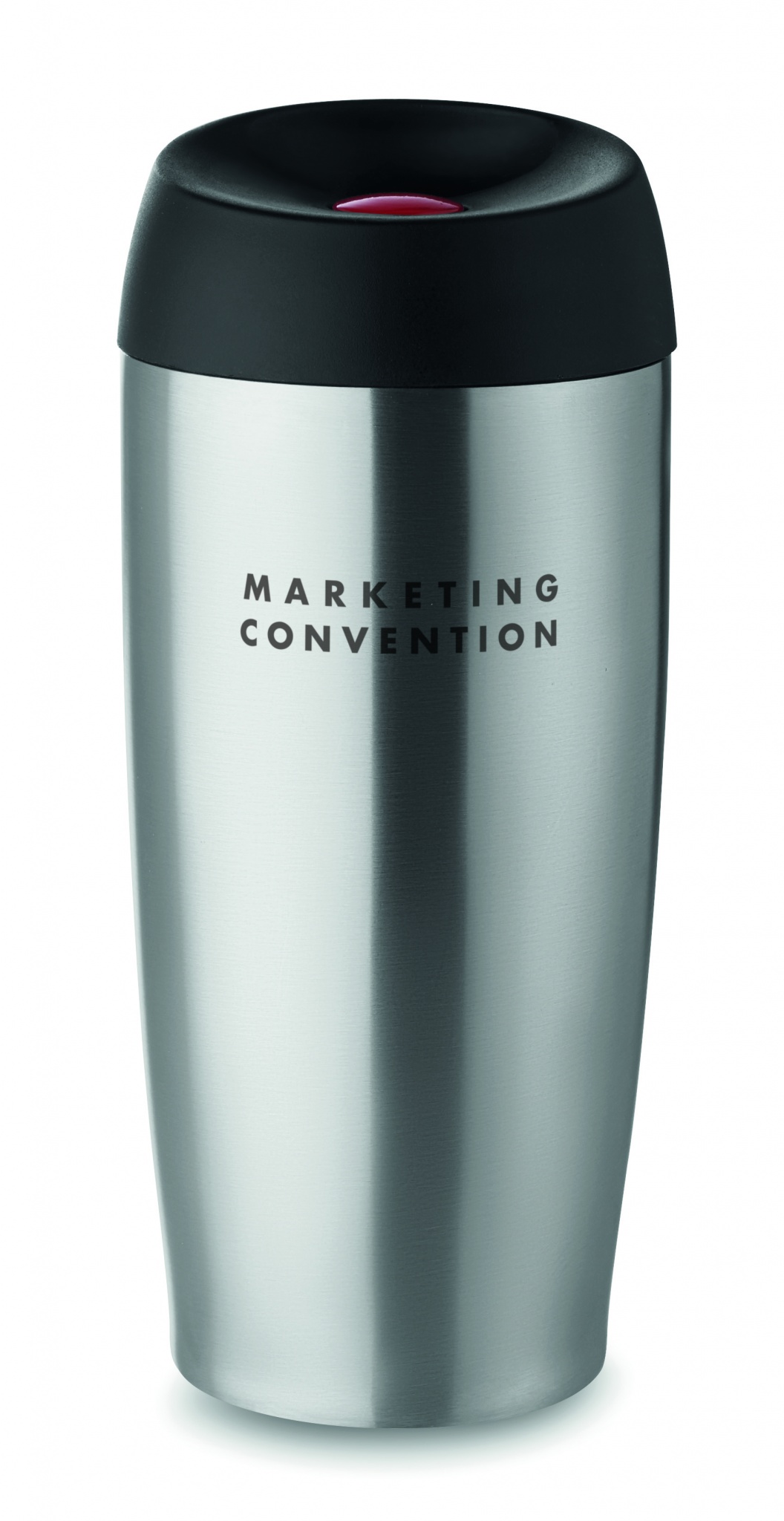 Double wall stainless steel travel cup with securable PP lid that has a push function and it is leak free. Capacity: 350 ml. Leak free.