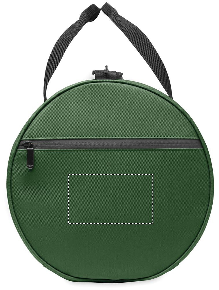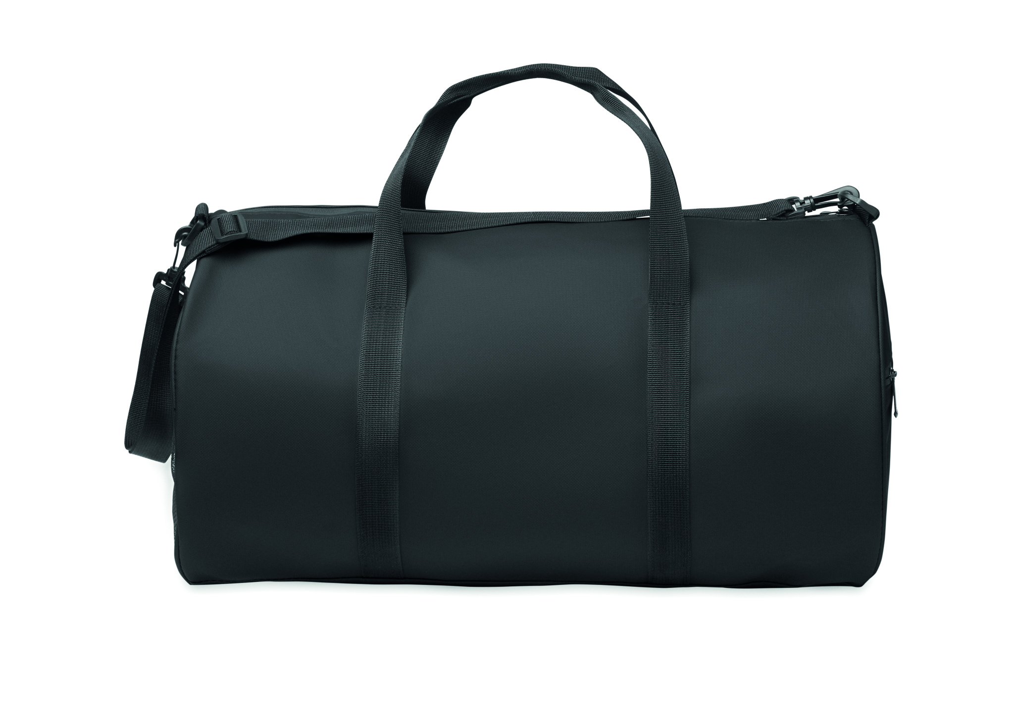 Duffle bag in 600D RPET polyester with PU coating. Front zippered pocket. Inside 210D RPET polyester lining. 1 side zippered compartment / 1 side mesh compartment. Zippered pocket inside.