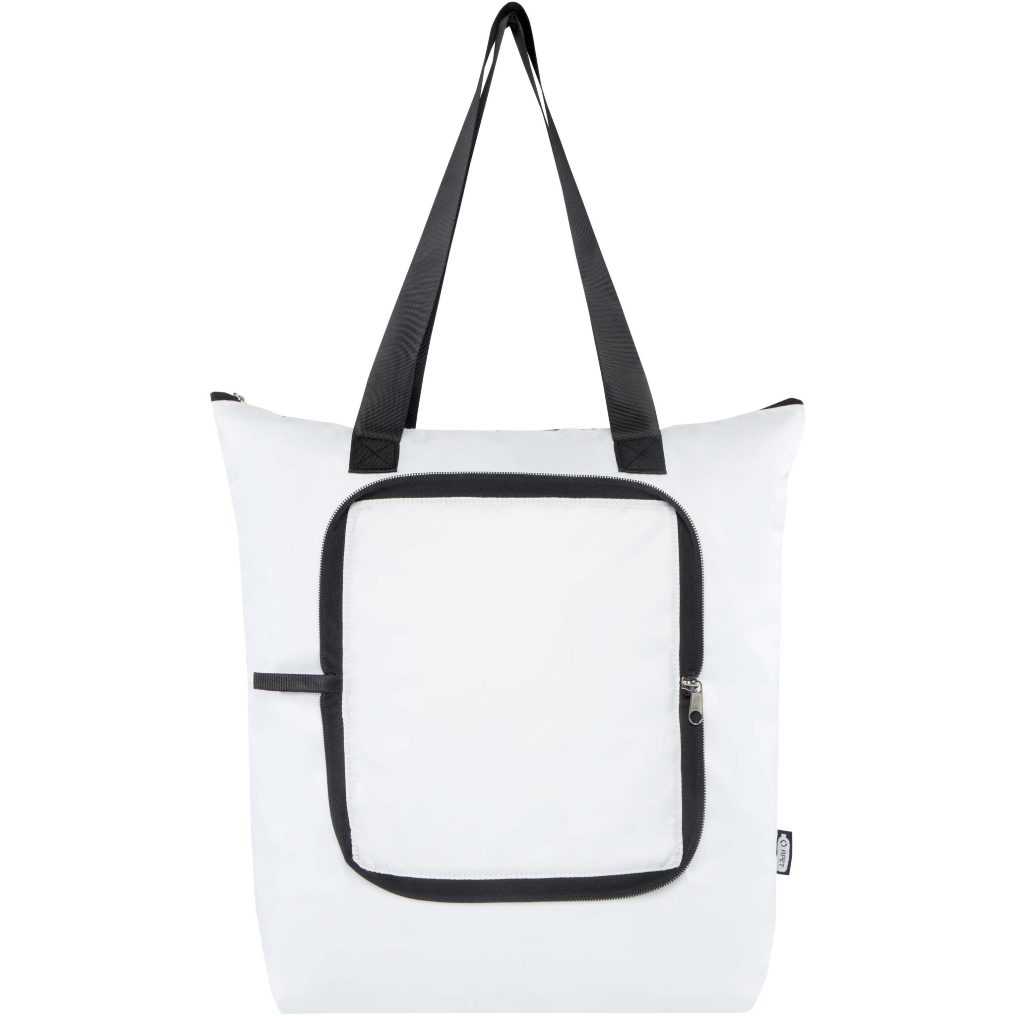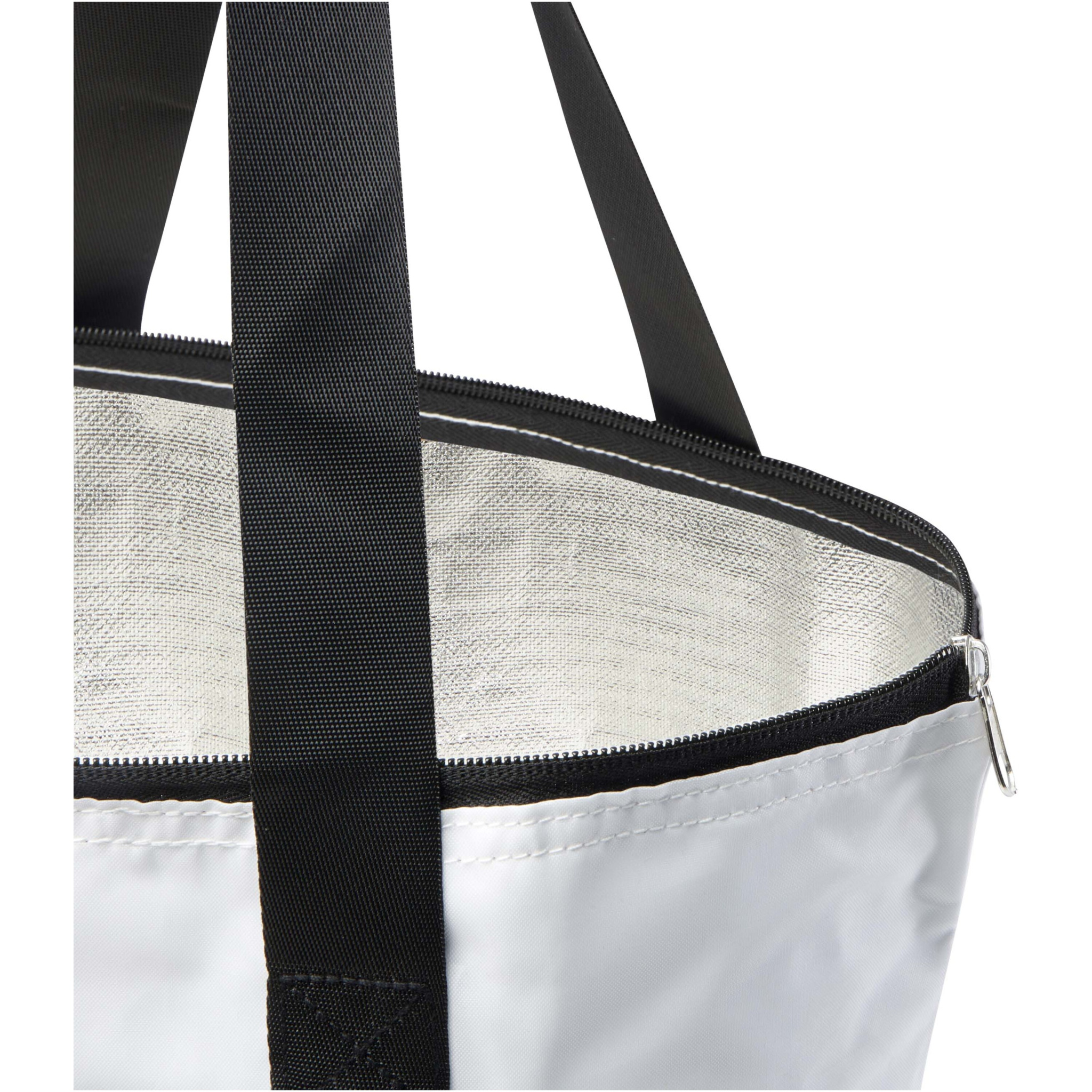 Designed for convenience and practicality, this lightweight yet durable tote cooler bag adapts to your needs by folding neatly into a compact pouch with a webbing loop to hang or carry around easily, making it perfect for picnics, grocery shopping, or outdoor adventures. Featuring a zipped main compartment with aluminium foil, a front open pocket, and two long handles made of quality smooth webbing material. Made of PVC free recycled polyester. Volume capacity: 15 litres.