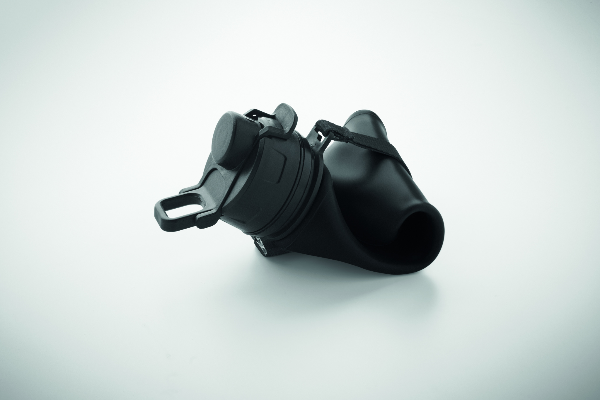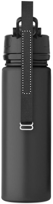 Foldable silicone sports bottle with PP lid, handle, polyester strap, and transparent buckle to secure when folded. Leak-free. Capacity: 500 ml.