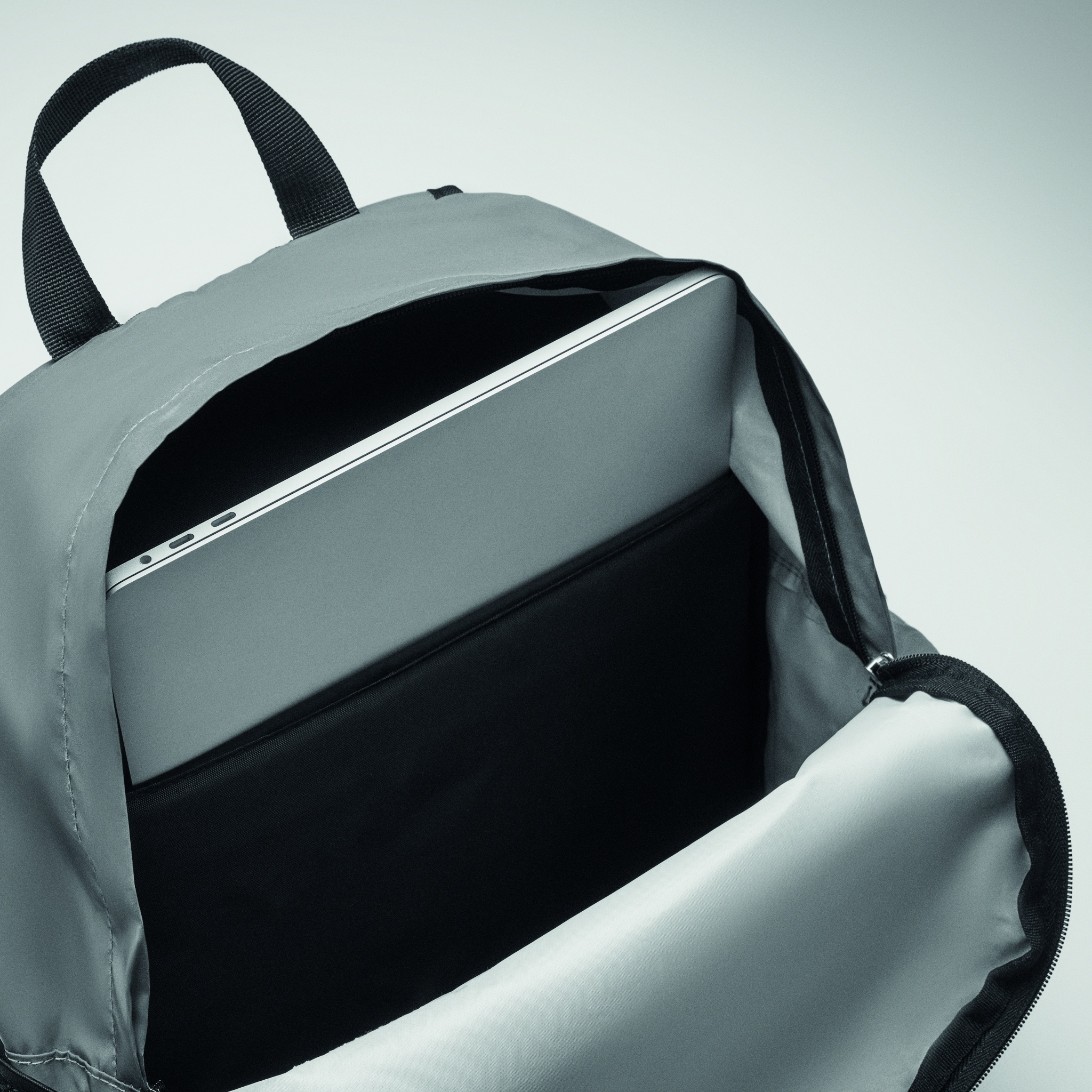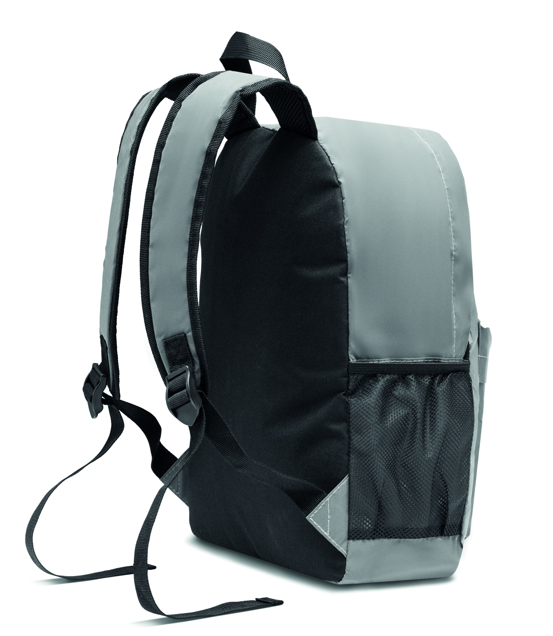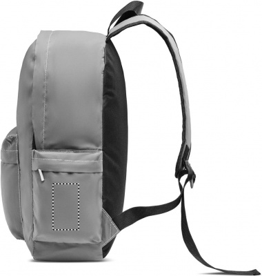 Backpack in high reflective 190T polyester and straps. It has 15 inch padded laptop compartment. Front zippered pocket, one side mesh pocket and other side zippered pocket. For comfort a padded back section in 600D recycled polyester.