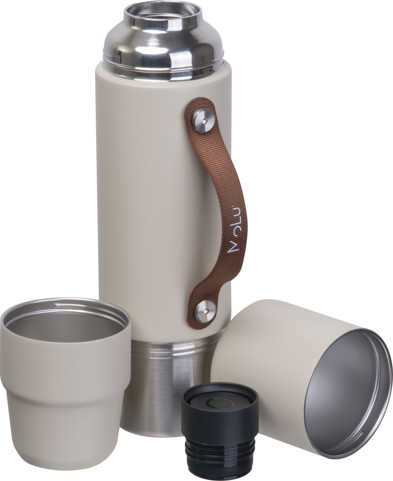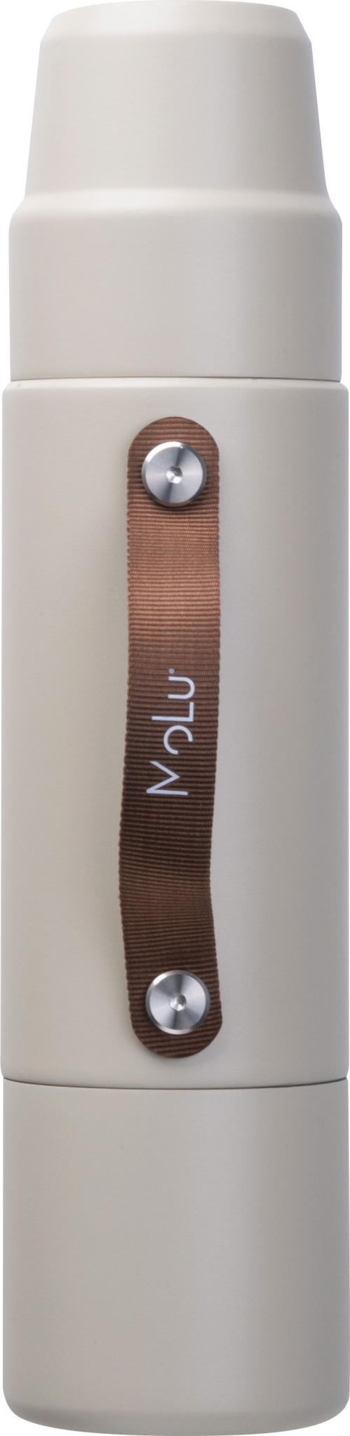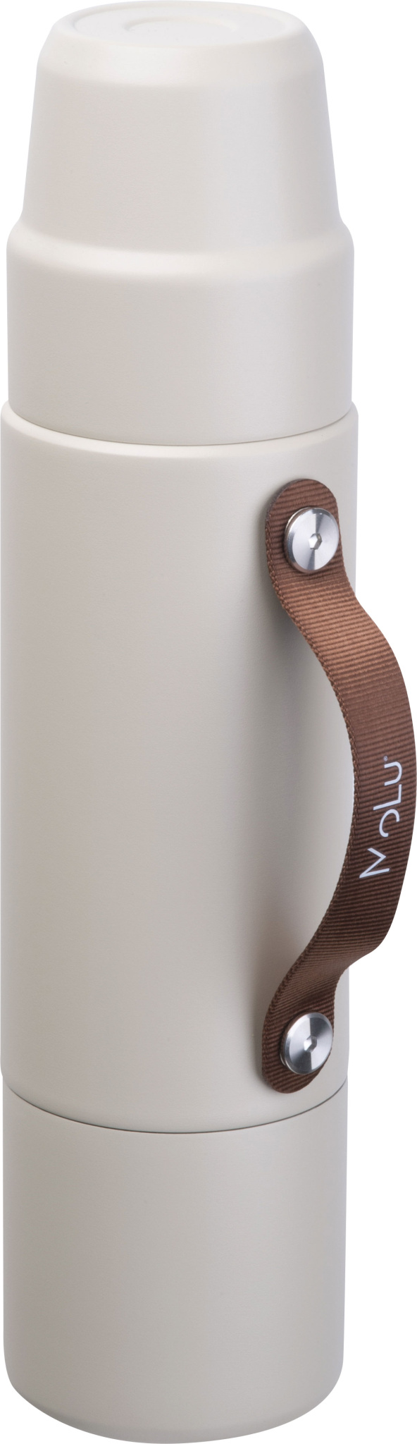 Made from recycled stainless steel, double-walled and copper-insulated – keeps drinks hot or cold for up to 20 hours. Integrated into the design: two cups – one in the lid, one at the base. Featuring a refined brown handle – ideal for drinking, pouring, or carrying. Thoughtfully designed, durable, and perfect for on the go – MoLu at its smartest.