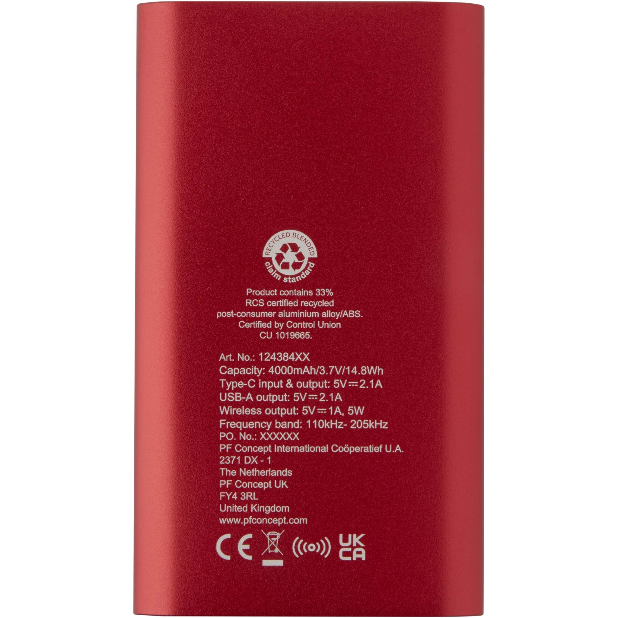 Power bank with Type-C in/output port and a USB-A port which means that 2 devices can be charged simultaneously. It also supports 5W wireless charging for all Qi enabled devices. The power bank features a 4000 mAh lithium polymer battery which delivers a total output power of max. 10W. This power bank is made of 28% RCS certified recycled plastic. Delivered with a TPE Type-C to USB-A charging cable.