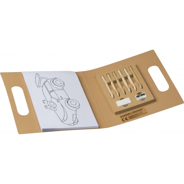 Coloring book folder with recycled cover, paint block (30 sheets), carrying holder, sharpener, eraser, and crayons in 6 different colors. Your logo will be printed on the cover.