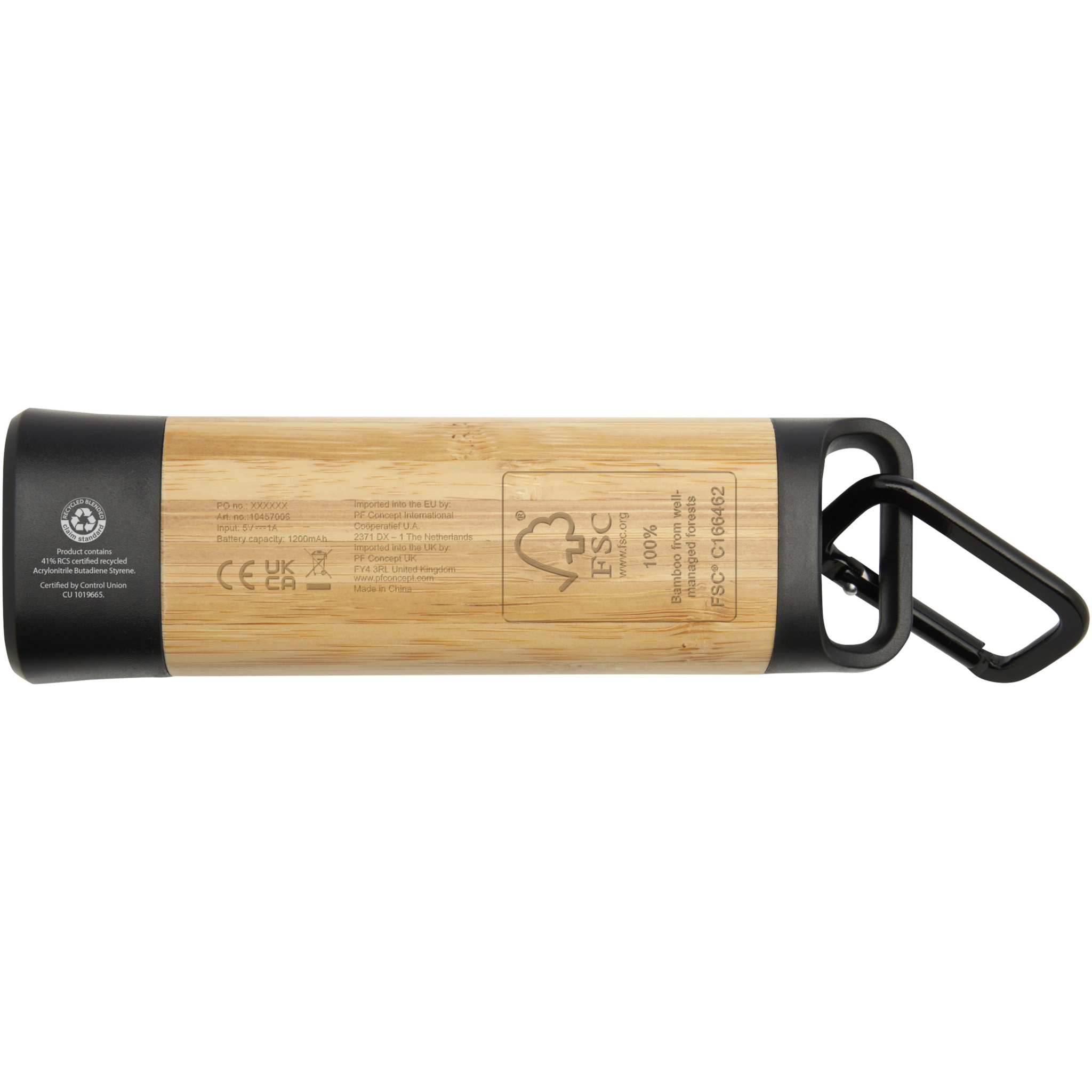 The Kuma torch with carabiner is crafted from certified bamboo and 41% RCS certified recycled plastic, making it a more sustainable choice for exploring the outdoors, tackling DIY projects, or navigating power outages. Featuring a powerful 3W COB light source available in 3 different light modes, the Kuma produces 80 lumens of light with a beam distance of up to 100 meters when fully charged. Equipped with a high-capacity 1200 mAh Li-ion 18650 battery, the torch ensures longevity and reliability, producing 3.5-4.5 hours of continuous illumination on a single charge. The included aluminium carabiner allows for easy attachment to backpacks, belts, or gear, making it a trusty companion for camping or hiking. Since bamboo is a natural product, there may be slight variations in colour and size per item, which may affect the final printing outcome. Delivered with a 30 cm TPE Type-C charging cable, and packed in a STAC gift box from sustainable sources.