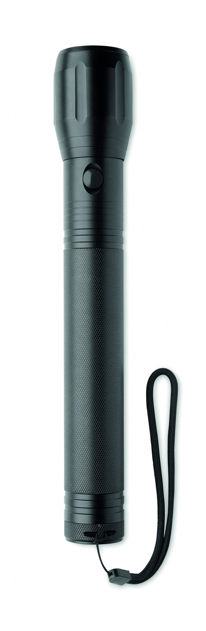 Large aluminium zoomable 1 LED flashlight torch and detachable strap. Output: 300 lumen. 3 D batteries excluded.