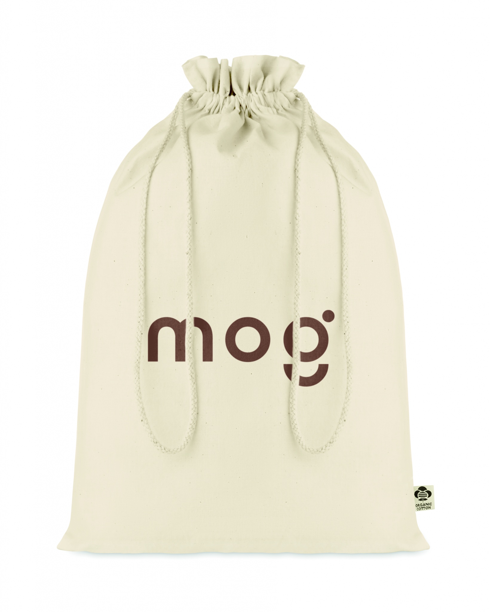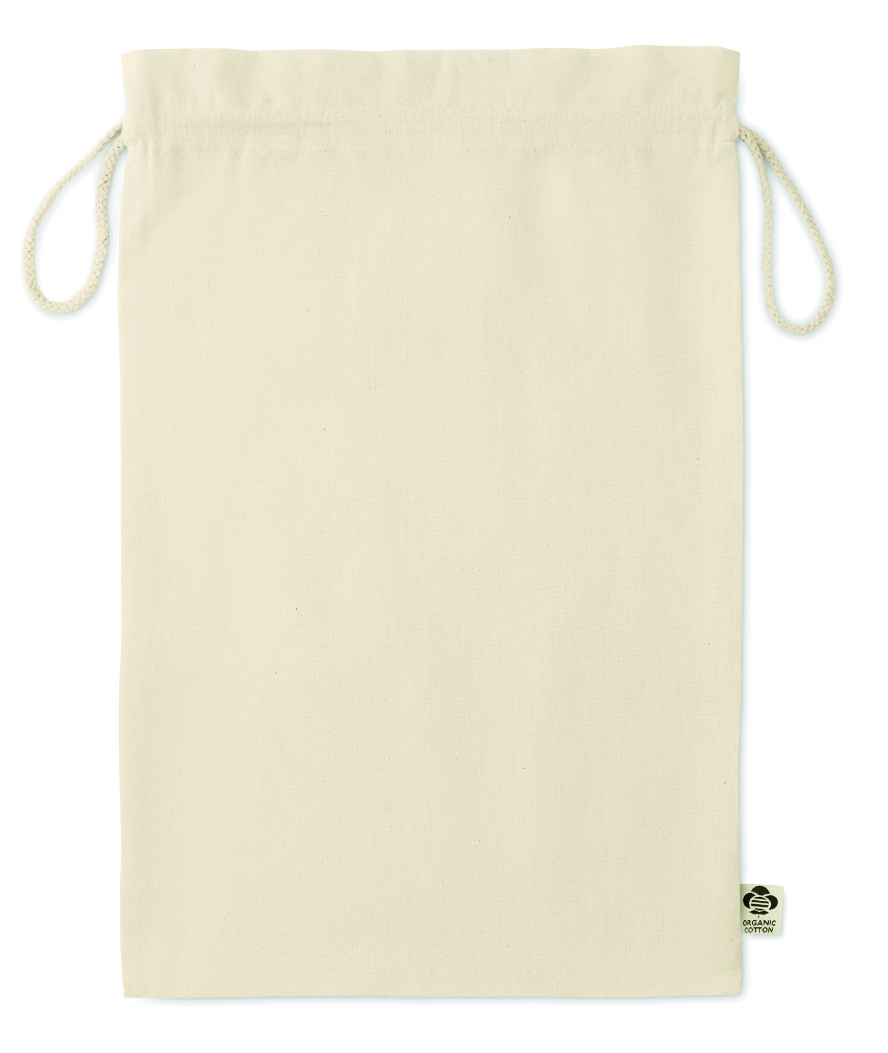 Large gift draw cord bag in organic cotton. Size approx. 30 x 47 cm. 105 gr/m².