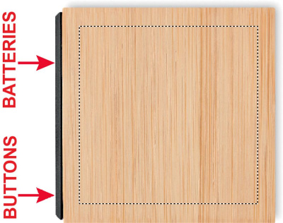 White LED time display alarm clock and temperature display in bamboo casing. 4 x AAA batteries not supplied or AC-DC 2 pin plug adapter included. Not suitable for UK use. Bamboo is a natural product, there may be slight variations in colour and size per item, which can affect the final decoration outcome.