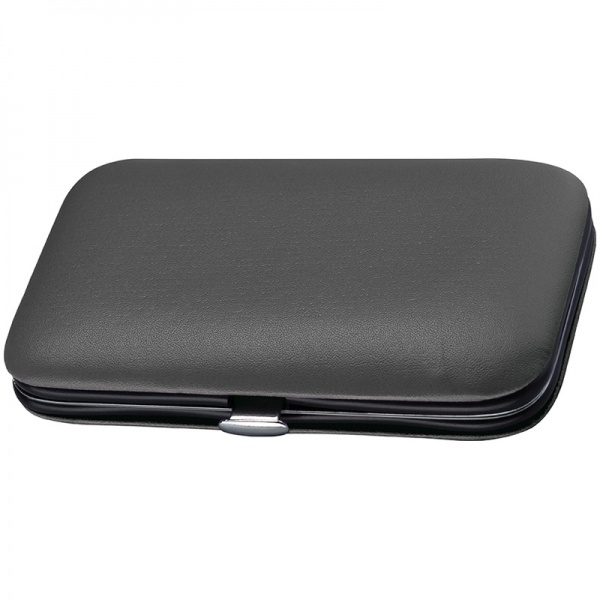 Manicure set in PVC case with metal frame including nail scissors, nail file, nail clippers and tweezers. We print your logo on the case.