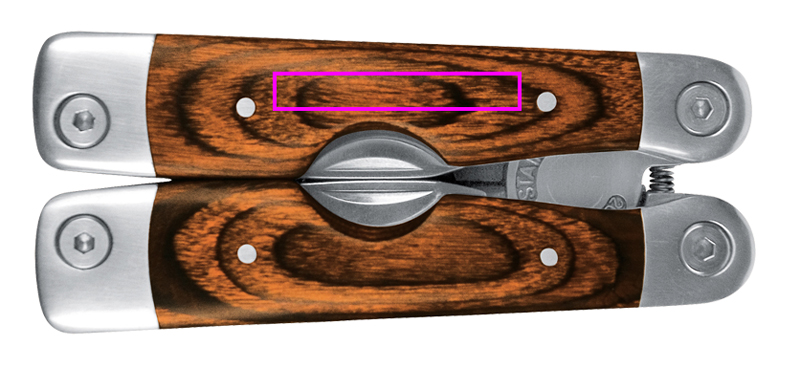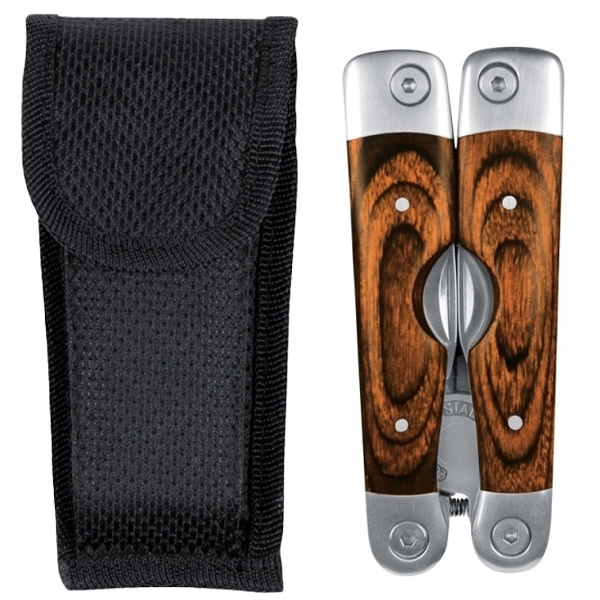 Stainless steel multifunction tool, with chic wooden shells on the handles: large pliers with cutting function, small saw with measuring unit and file, knife, Phillips screwdriver, three screwdrivers in different widths, small knife with cable insulation remover and can opener. The multitool comes in a belt pouch so you can always carry it with you. We will engrave your logo on the handle.