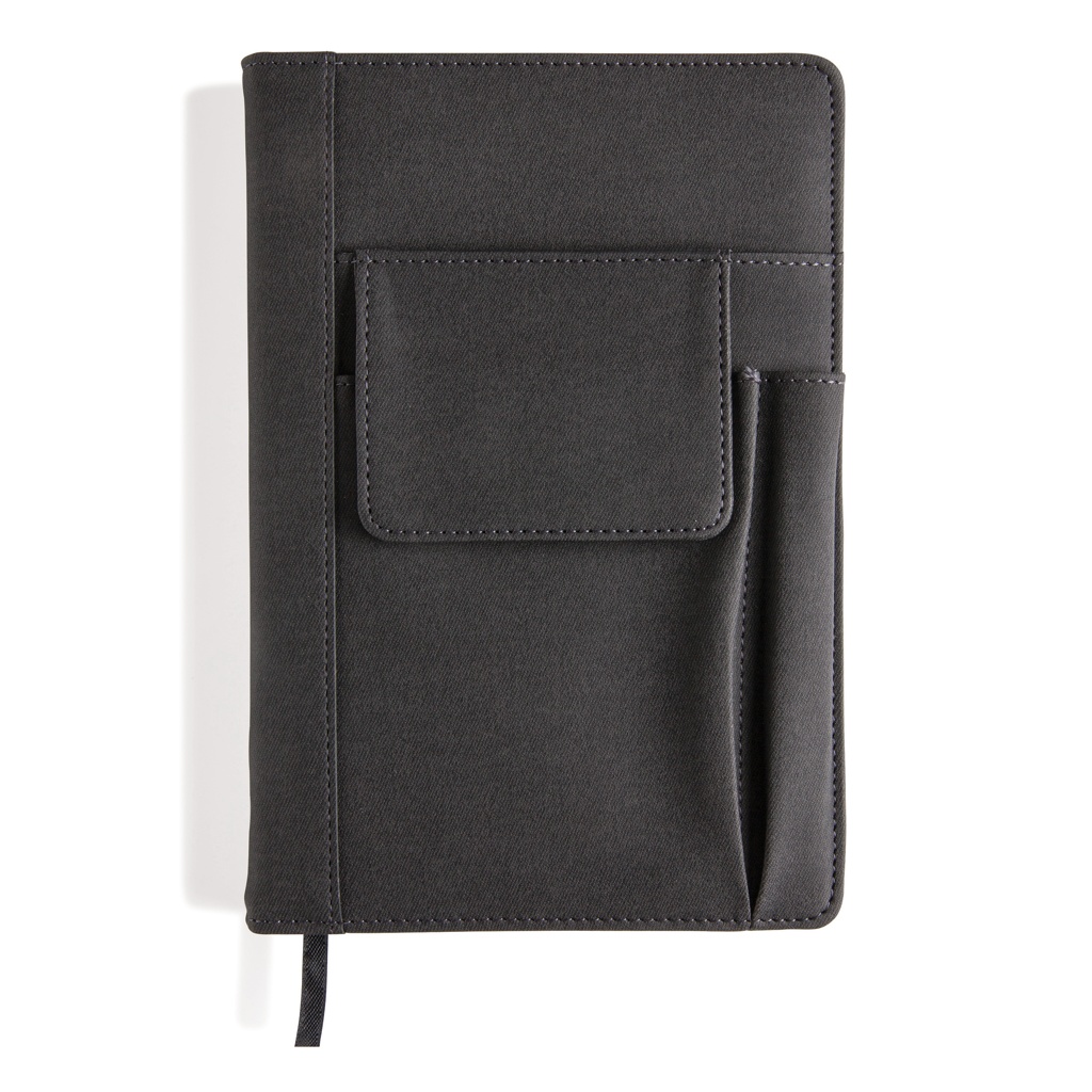 Coated PU notebook cover with a front phone pocket (14 x 10cm), pen pocket and one main pocket . Black page divider and 160 pages of 80g/m2 paper inside. This notebook cover can be re-used with new A5 notebook paper for endless writing.