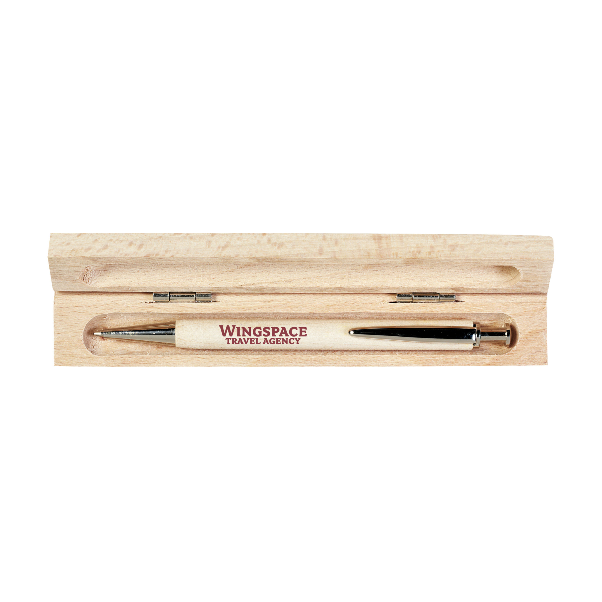 WoW! Blue ink, beech wood ballpoint pen with chrome clip, push button and point. In a beech wood case.