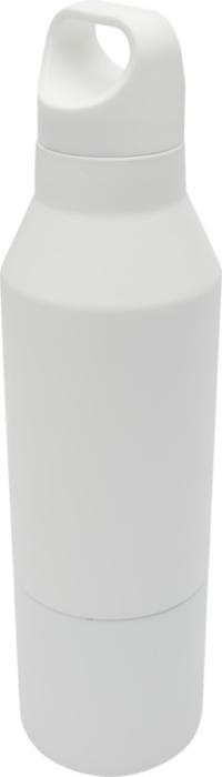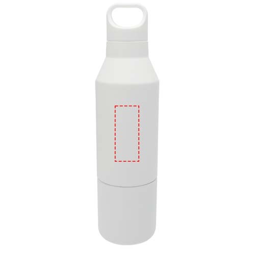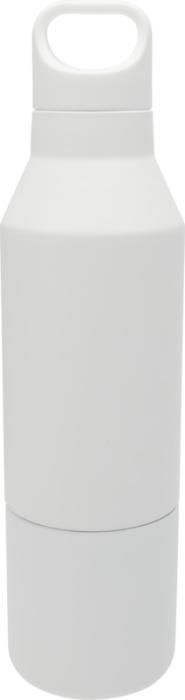 RCS certified stainless steel double wall copper insulated bottle with a removable cup. This multi-use bottle is designed to fit in the side pocket of a backpack, and has a convenient carrying handle that is integrated with the cap. Durable power coating on the outside. Keeps drinks hot for 12 hours or cold for 24 hours. Presented in a recycled cardboard gift box. Volume capacity bottle: 600 ml. Volume capacity cup: 300 ml.