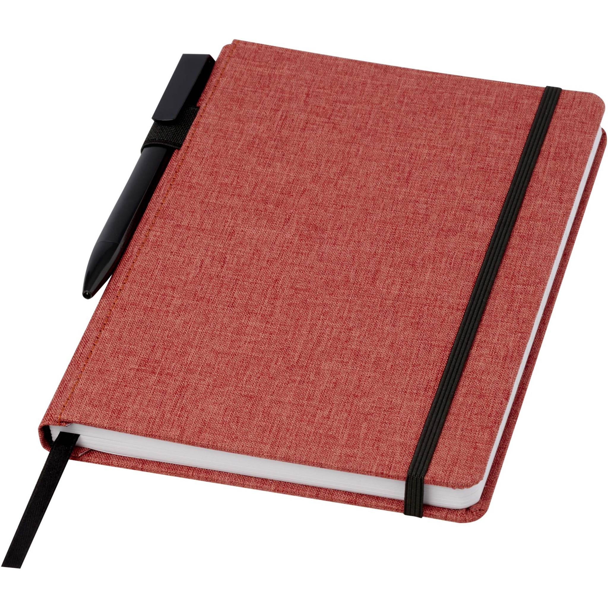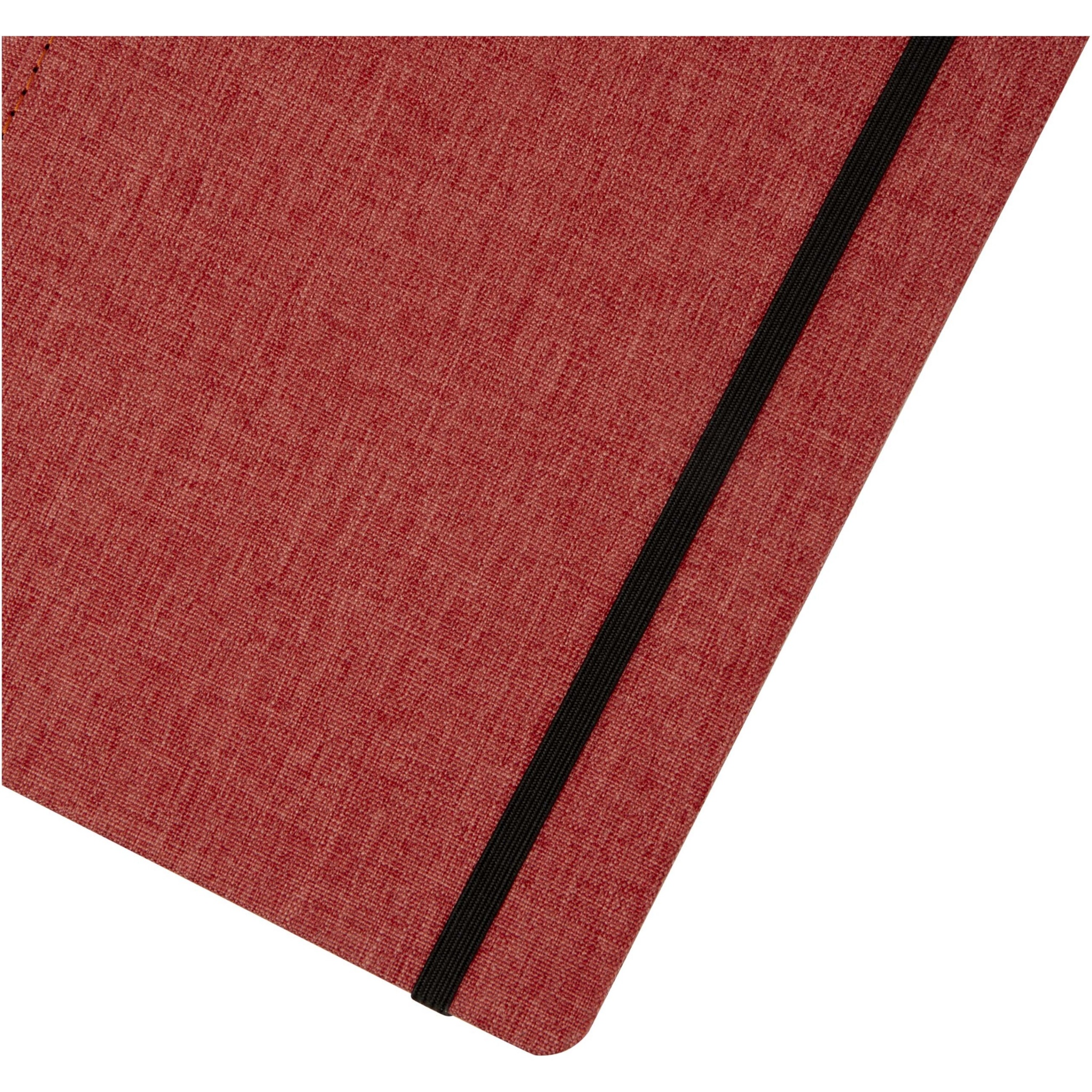 A5 size notebook with cover made of RPET fabric. Features 96 sheets 70 g/m² recycled paper with lined layout, a pen loop and ribbon marker. Packed in a cardboard sleeve.