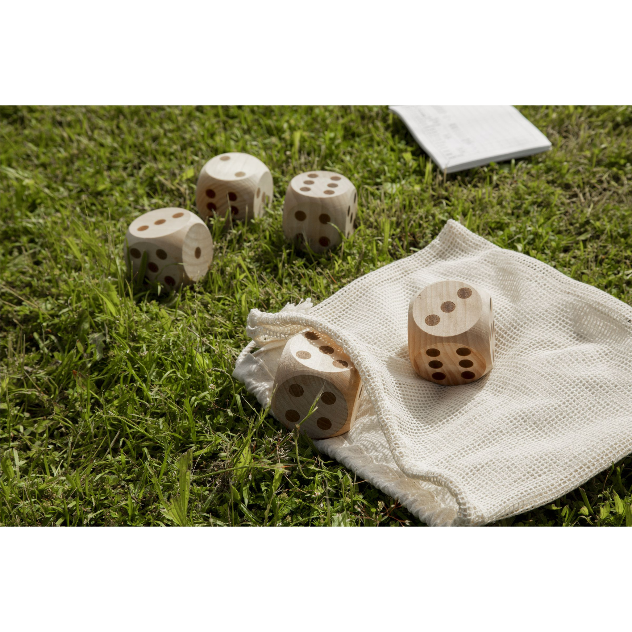 WoW! Make the right combinations with these five dice in an extra large size (5.5 x 5.5 cm). This game encourages playing outside together. The dice are made from FSC MIX certified pine wood. Includes score pad, rules and cotton storage bag. Entertainment for young and old. Items supplied as a set in a brown cardboard box.